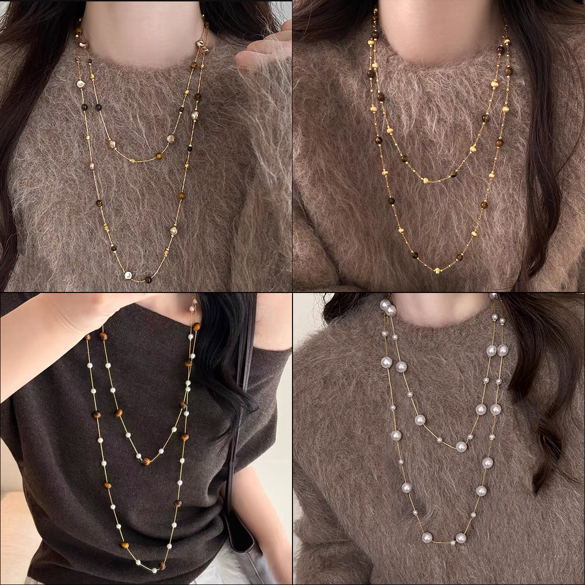 美拉德长款多层叠戴虎眼石项链女2025新款轻奢小众秋冬长款毛衣链