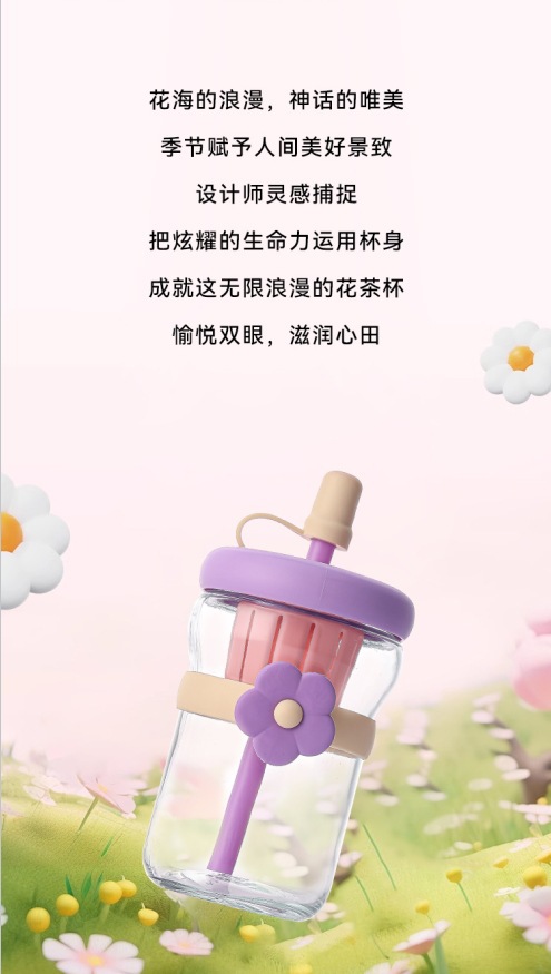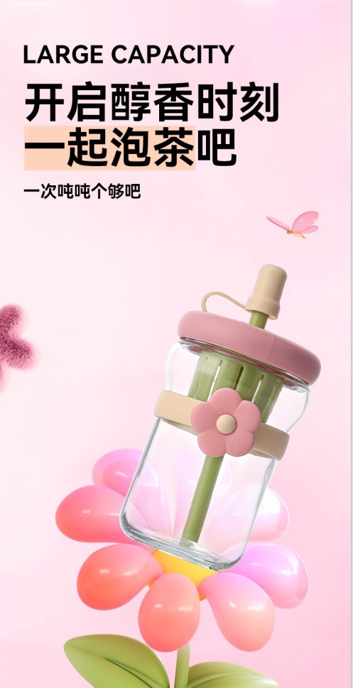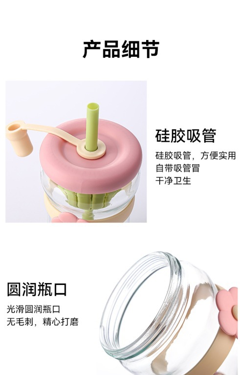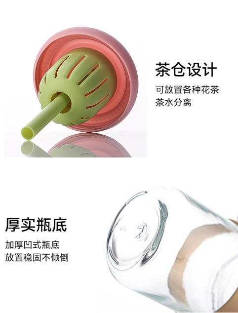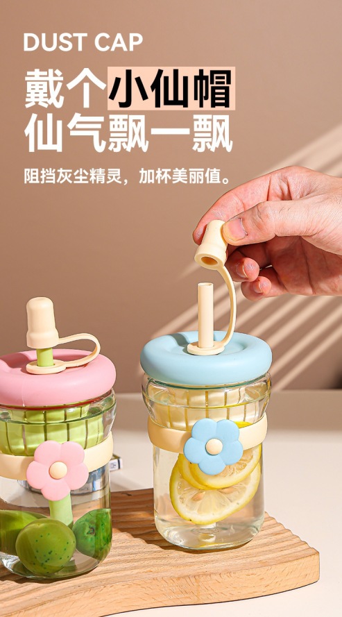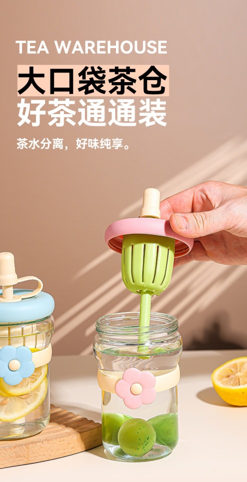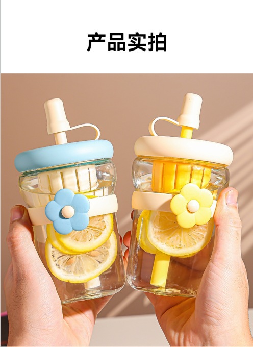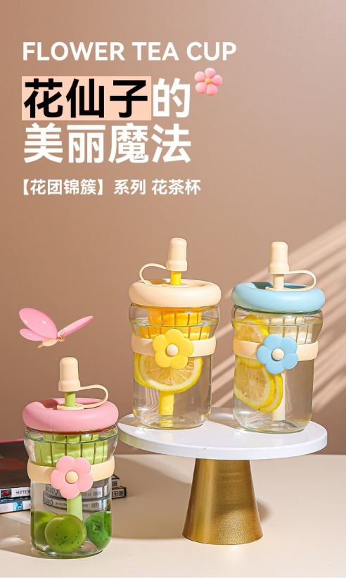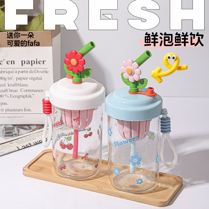 女の子向けの見栄えの良いフラワーウォーターカップ、ストローガラス、ポータブルティー水分離ジュースフラワーティードリンクカップ