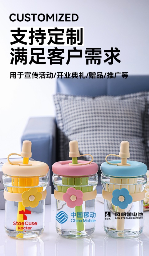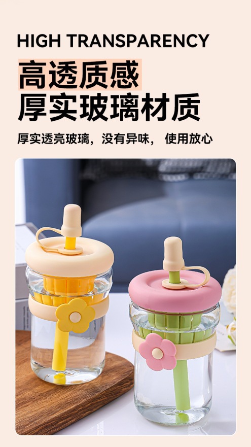 夏シンプルなフラワーカップストローコーヒーカップ女の子高見えガラスウォーターカップコンパニオンギフトカスタマイズ