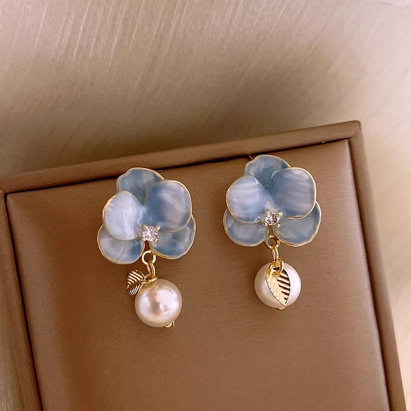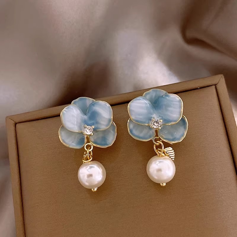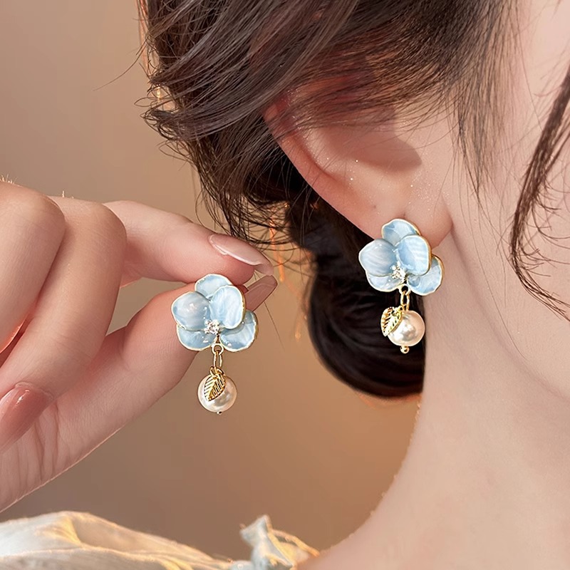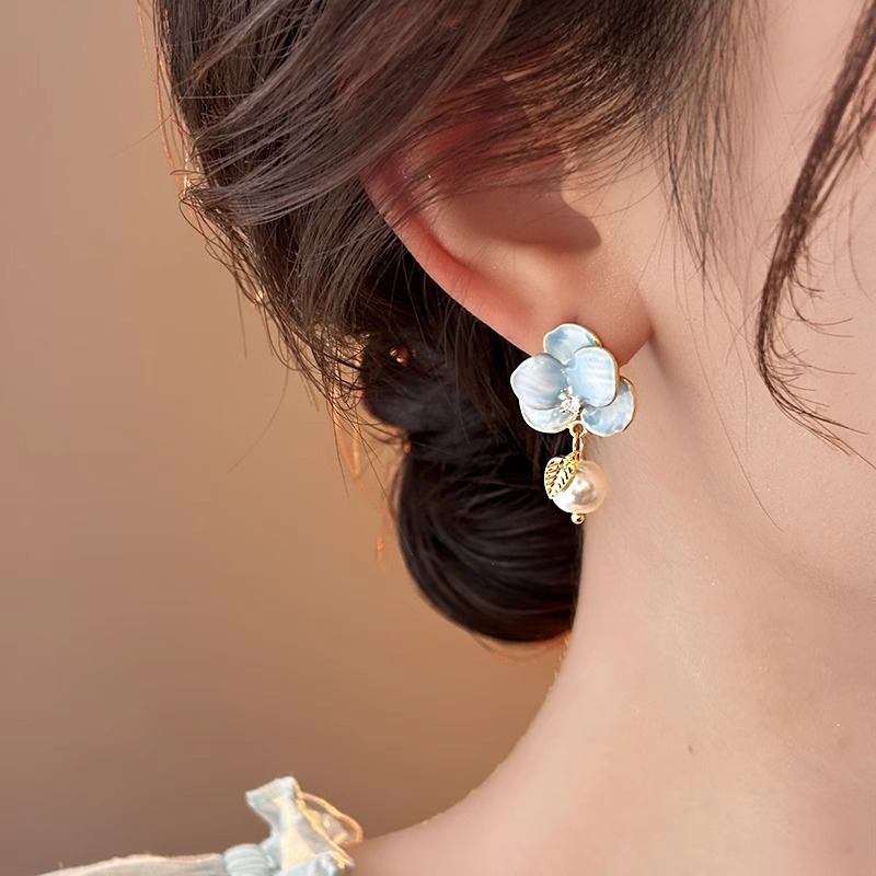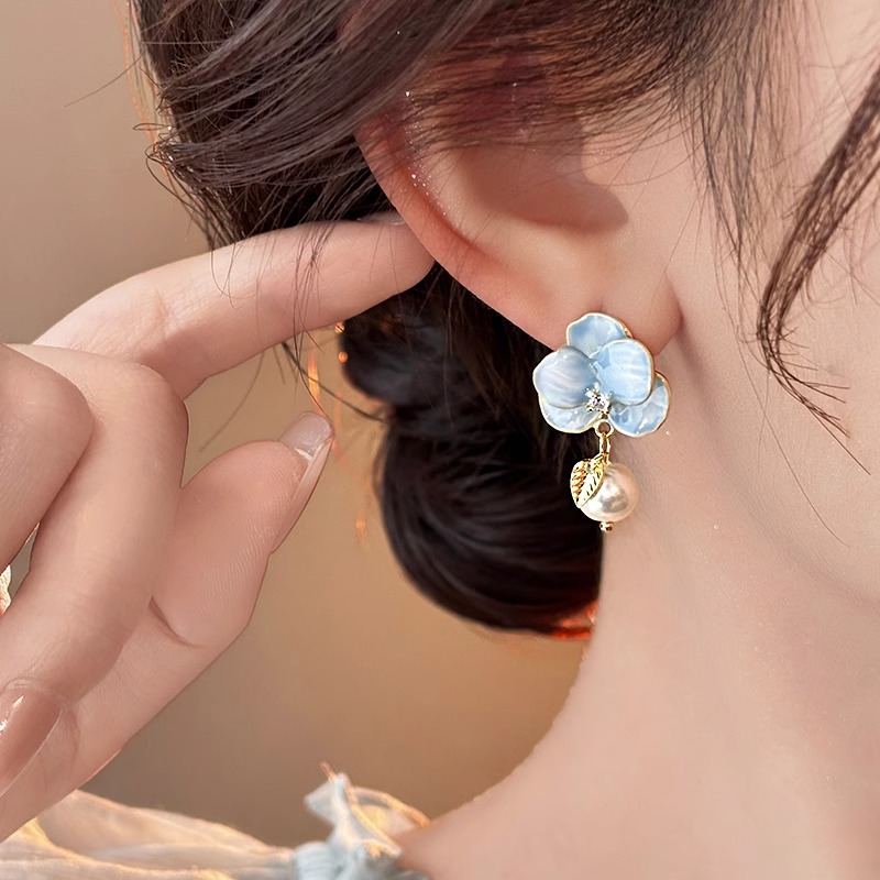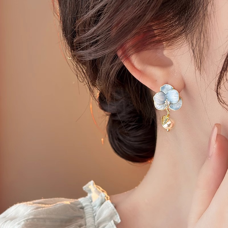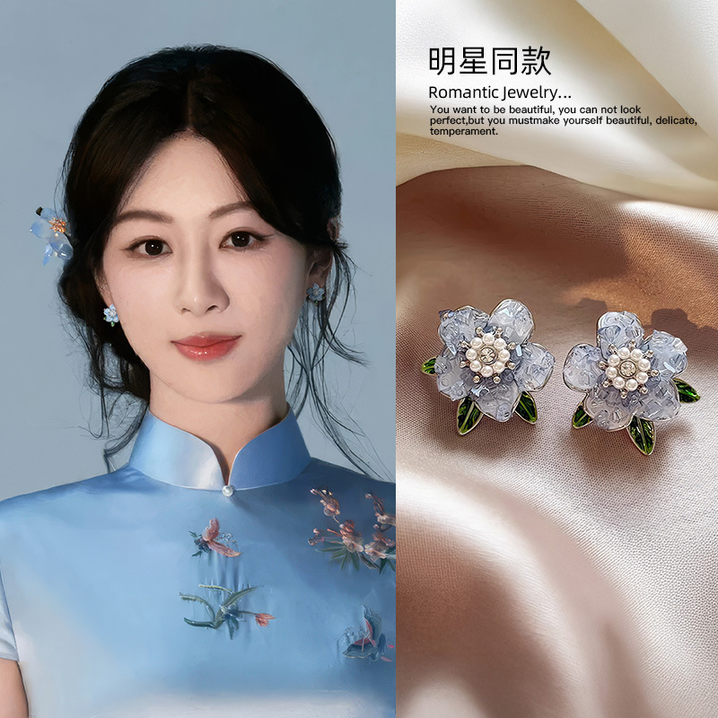 楊紫の同じタイプの青いツバキの花の水晶のイヤリングの女性の気質のピアスの甘い耳飾りの独特な2025新型の爆発金