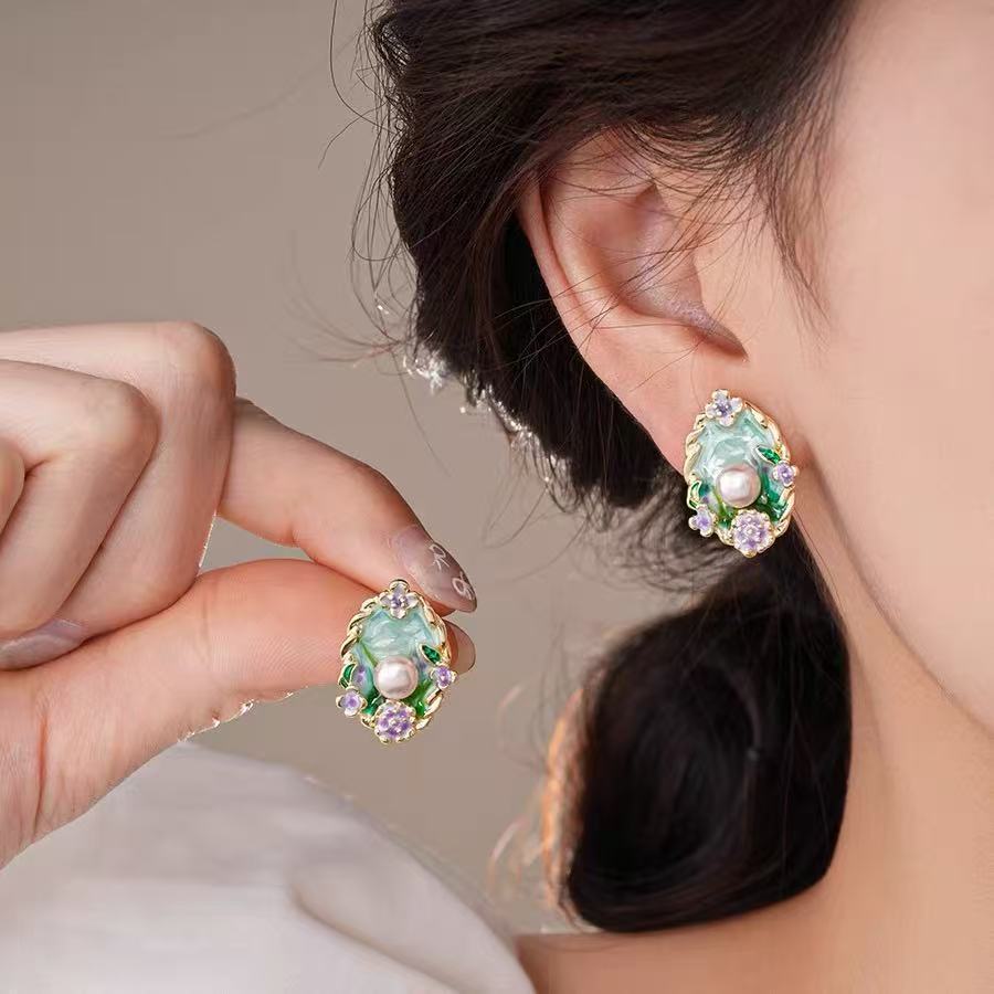 莫奈花园油画风滴釉珍珠花朵耳钉耳环轻奢高级感独特设计百搭耳饰