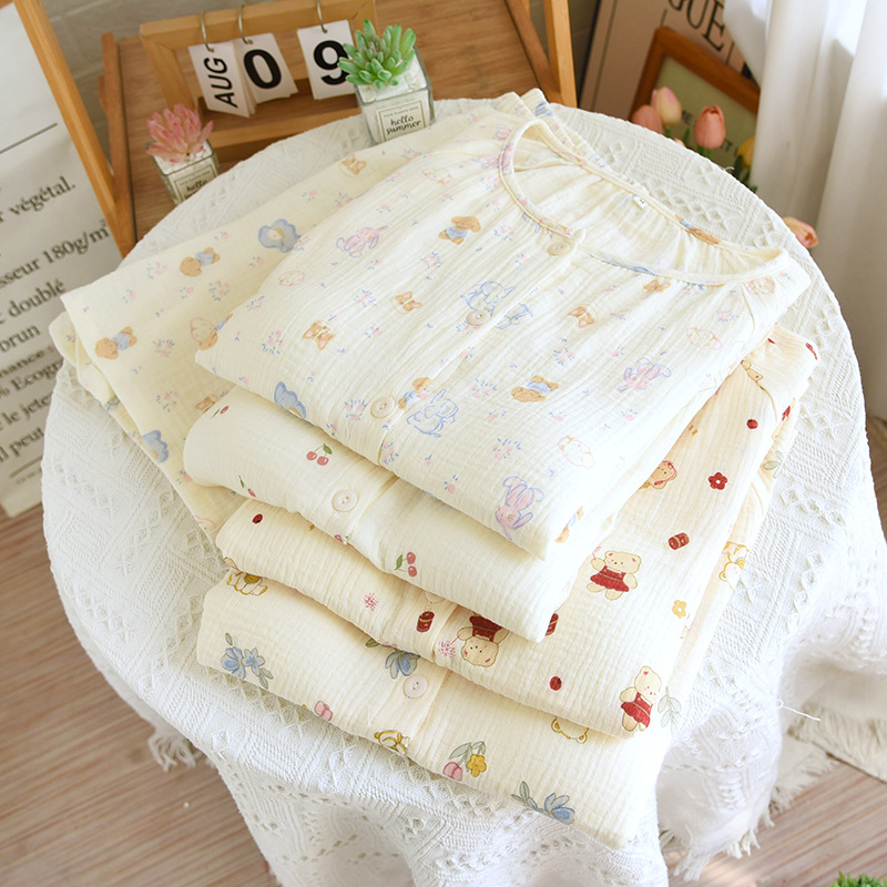 色織りジャカード綿ガーゼパジャマ女性四季国風薄い襟カバー9分袖ズボンホーム服