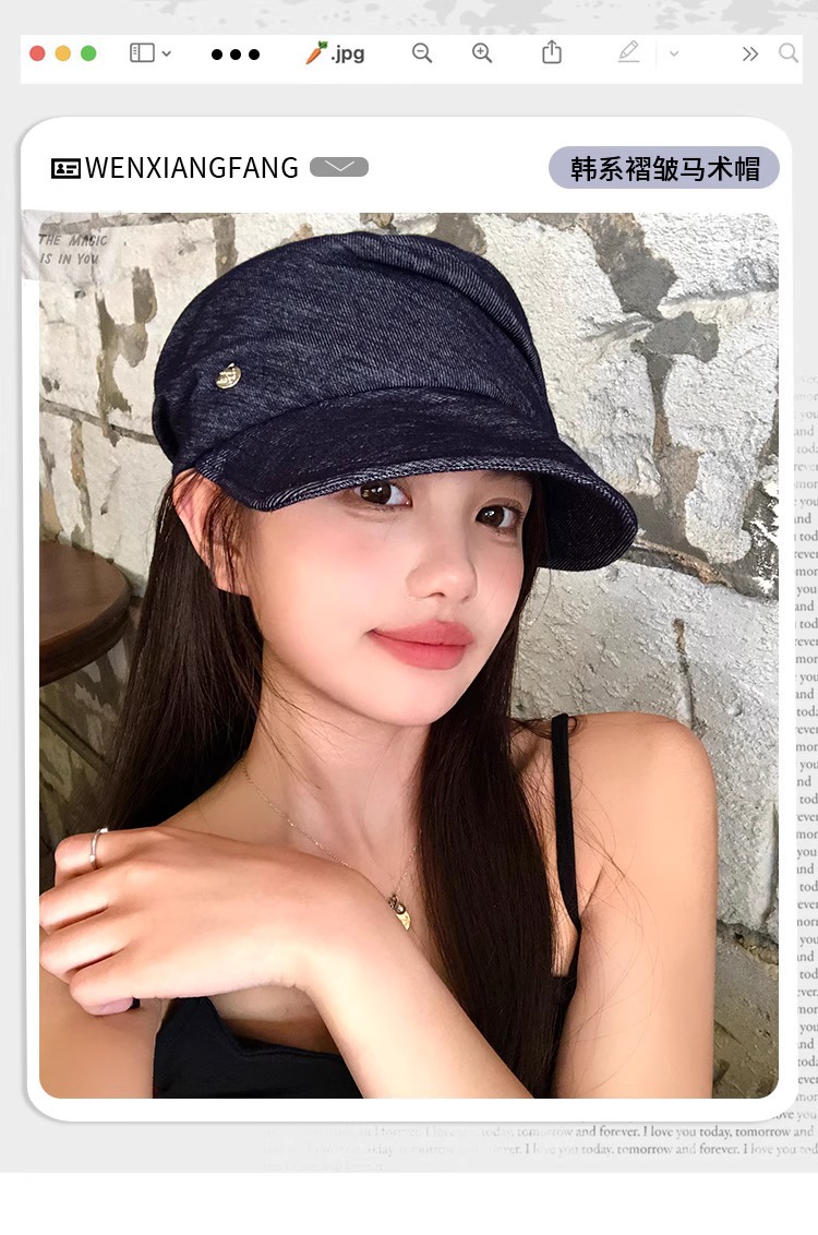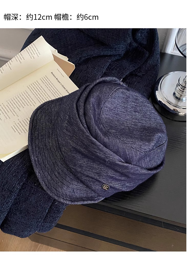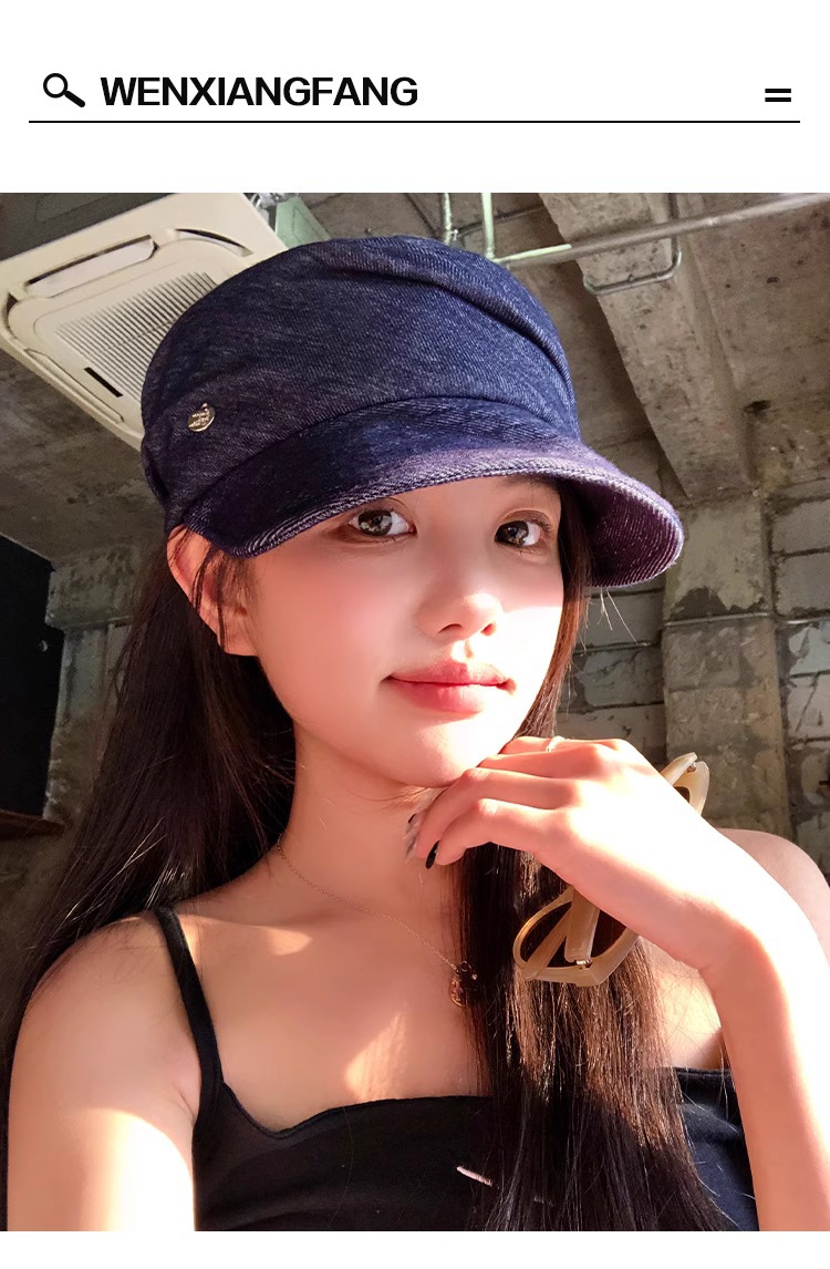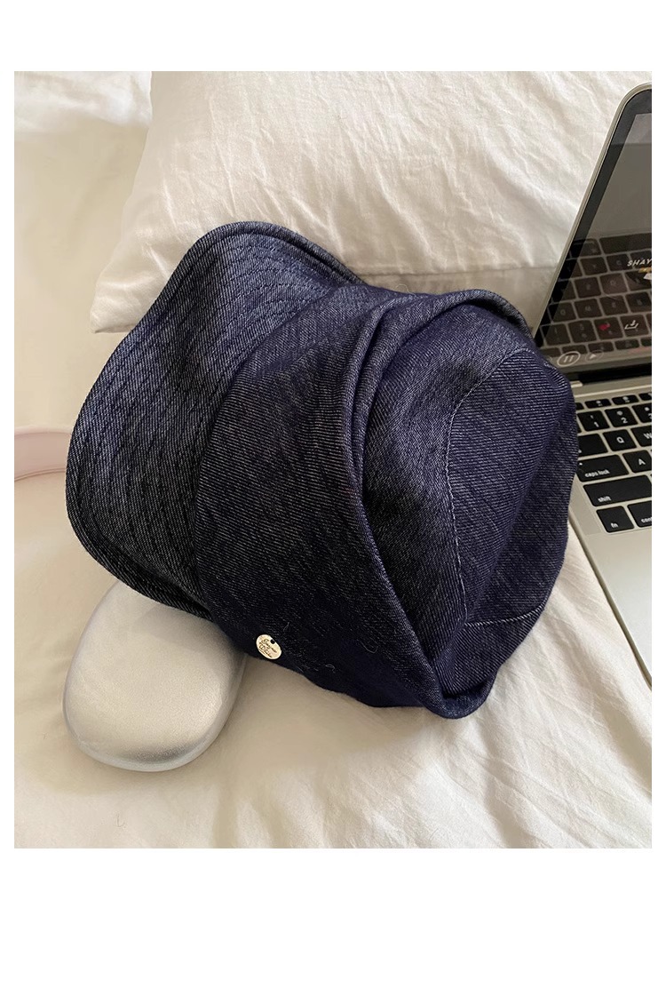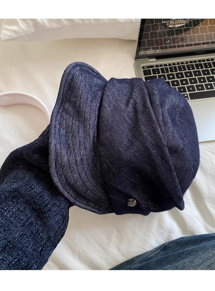 レトロなブルーのプリーツデニム乗馬帽子、フェミニンで多用途なペインターハット、大きな頭囲、顔が見える小さなひさし付きキャップ、トレンディです。