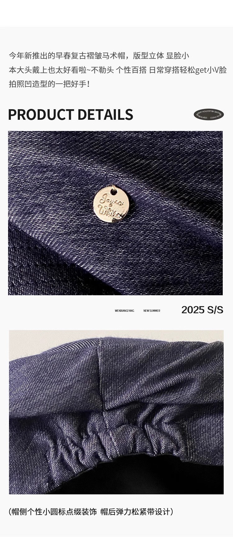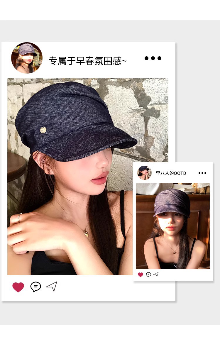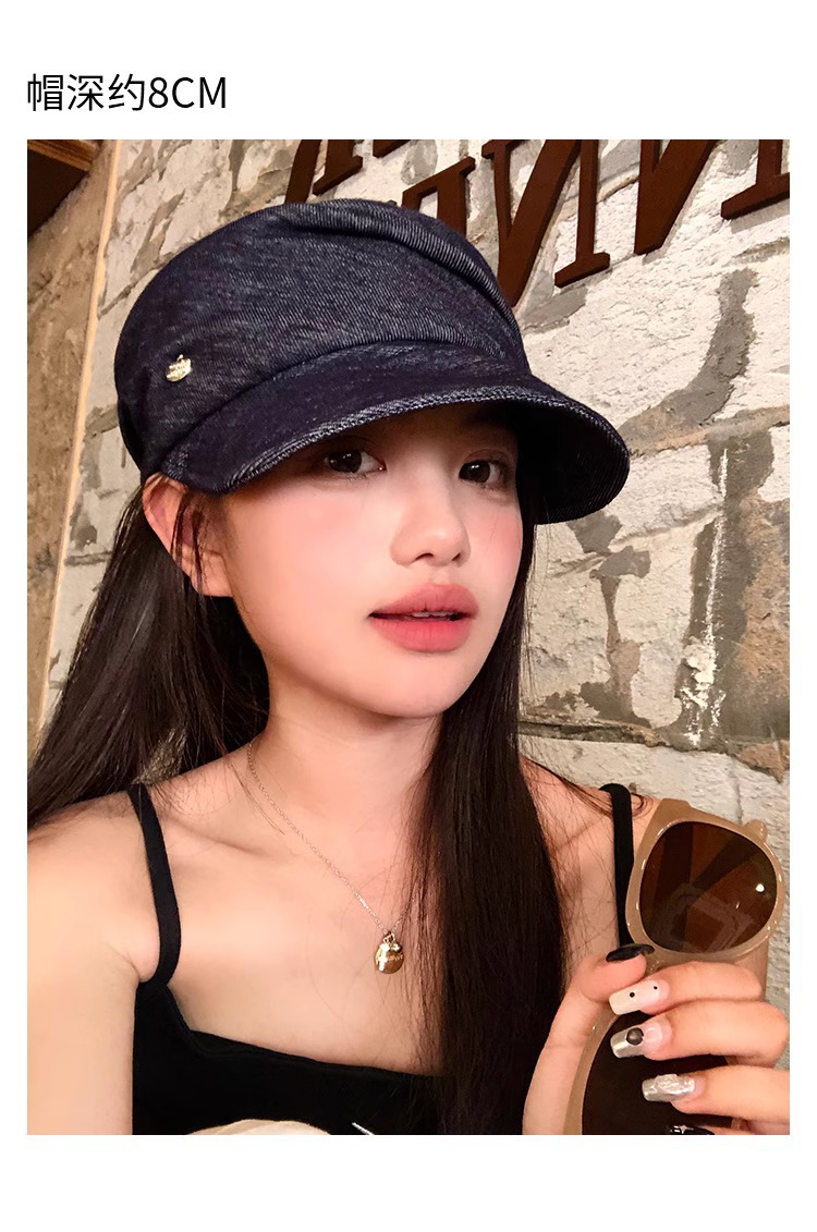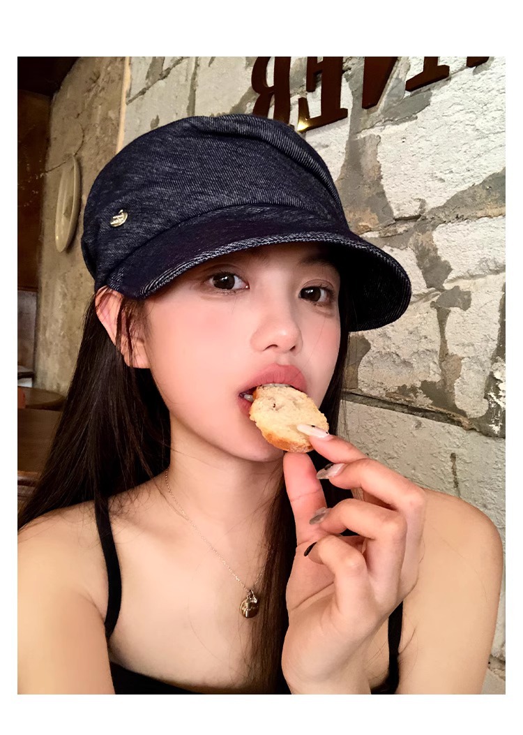 レトロなブルーのプリーツデニム乗馬帽子、フェミニンで多用途なペインターハット、大きな頭囲、顔が見える小さなひさし付きキャップ、トレンディです。