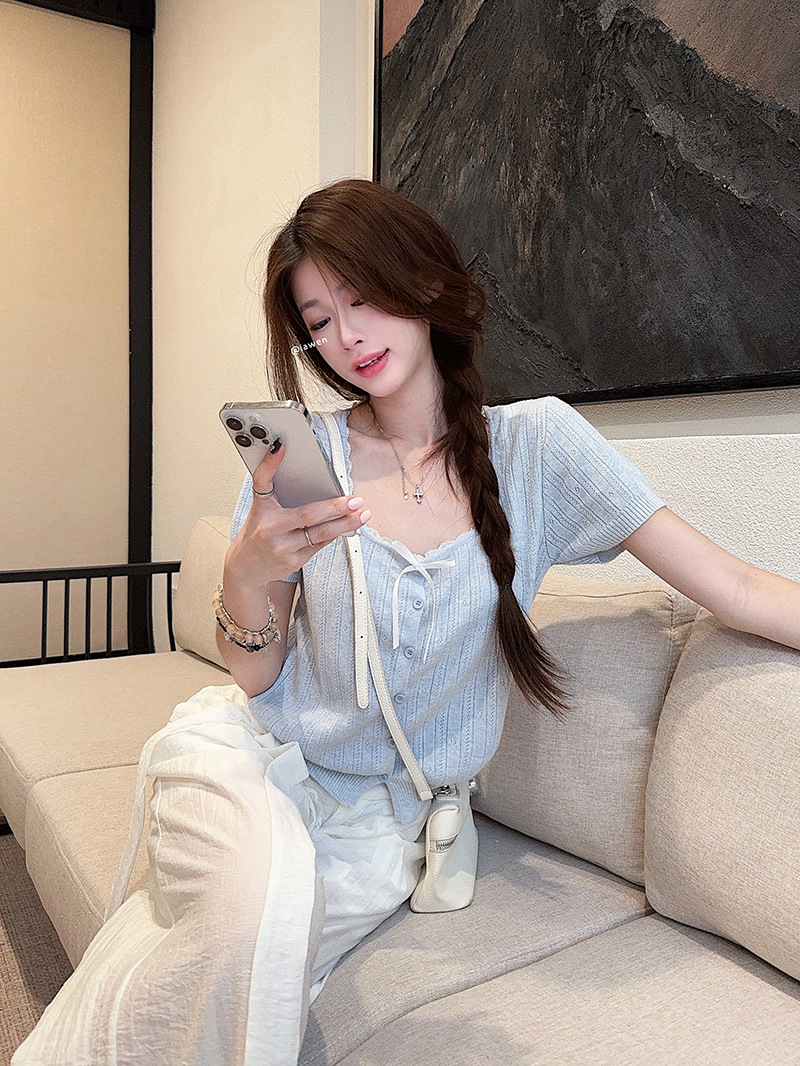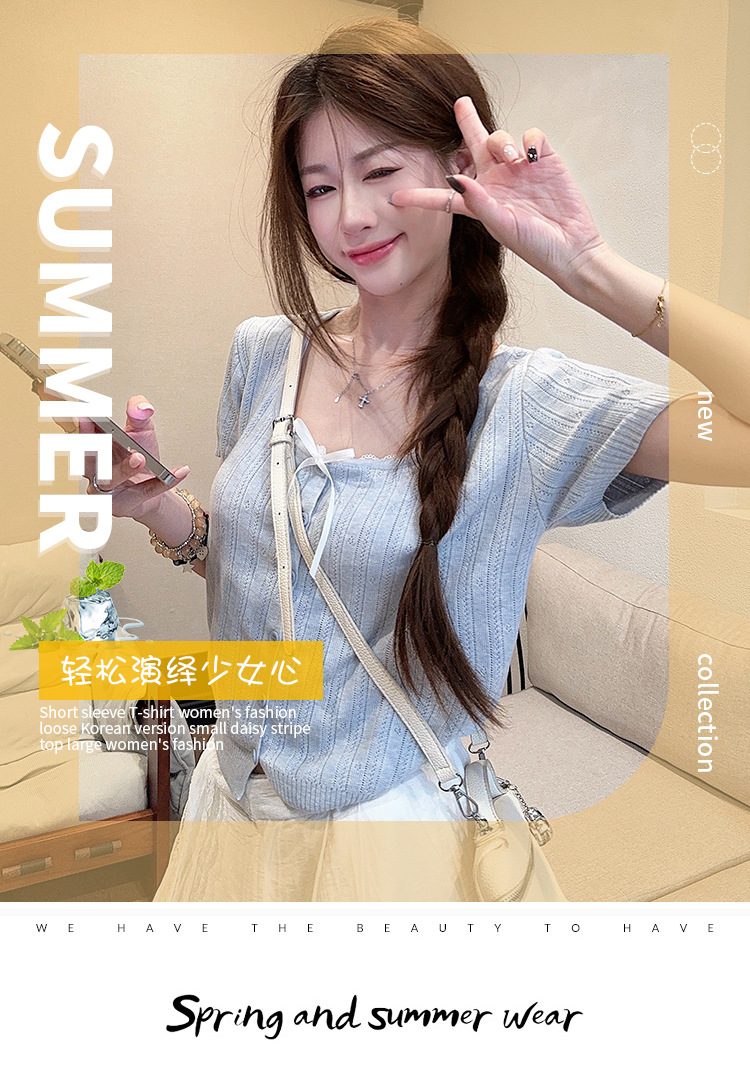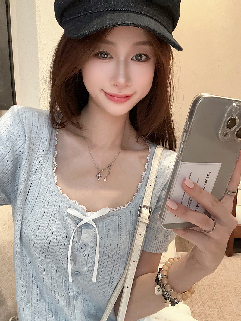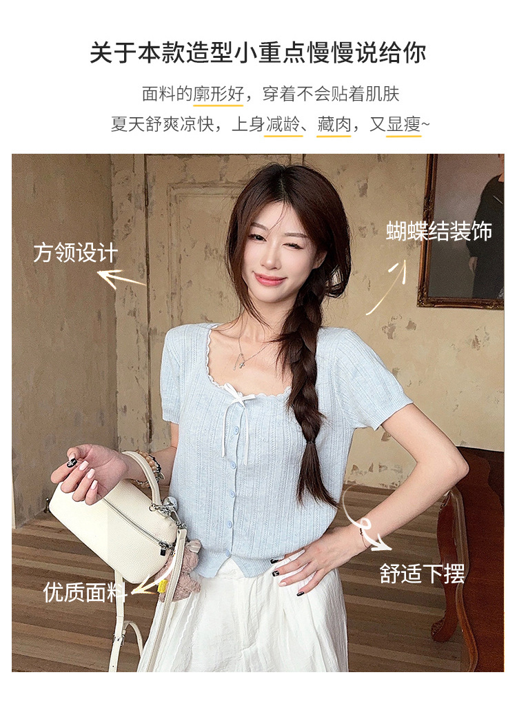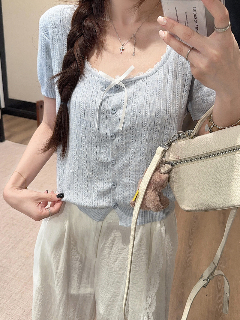 6枚のウール半袖Tシャツセーター2025年夏カーディガントレンディなレースショートラウンドネックトップス女性用のリアルショット