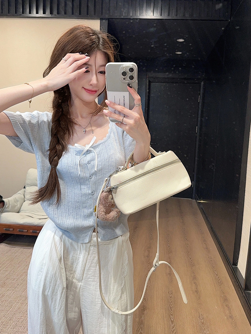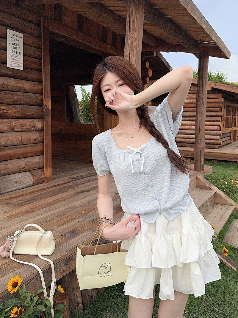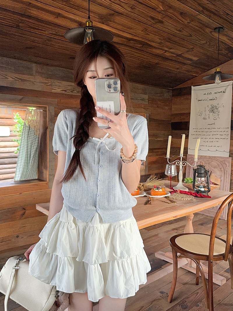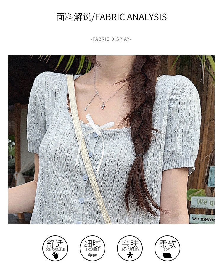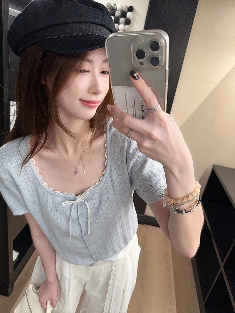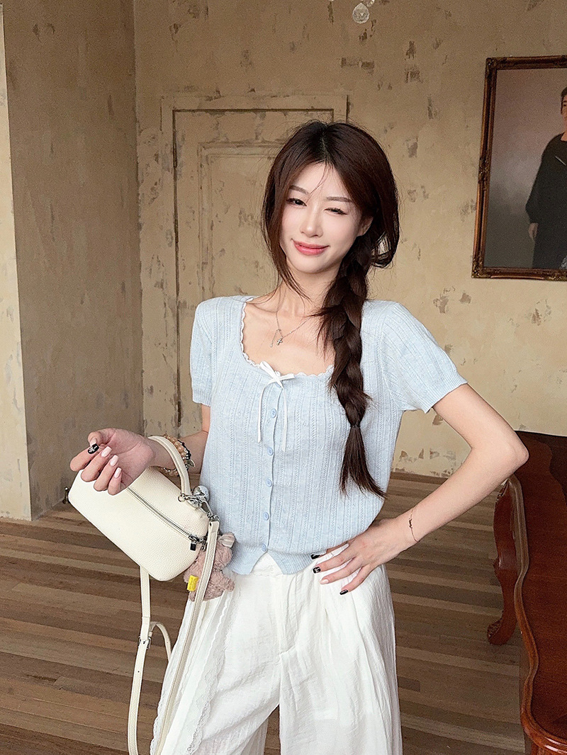 6枚のウール半袖Tシャツセーター2025年夏カーディガントレンディなレースショートラウンドネックトップス女性用のリアルショット