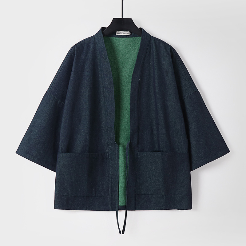 大きいサイズのリバーシブルデニムピュアコットン中国漢服ローブレトロ斜め前立てルーズ七分袖紳士服
