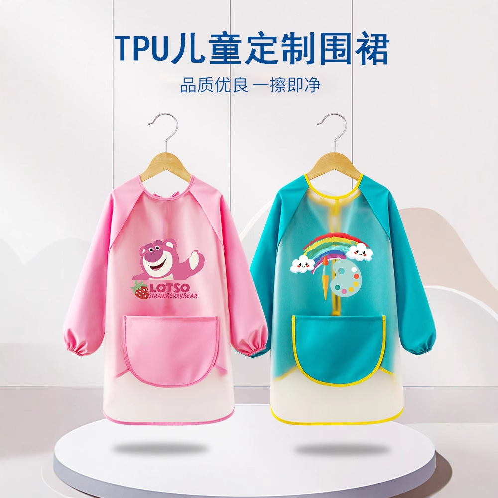 洗濯不要のTPU長袖子供用エプロン、逆着用幼稚園男女漫画動物防水防汚スモックエプロン