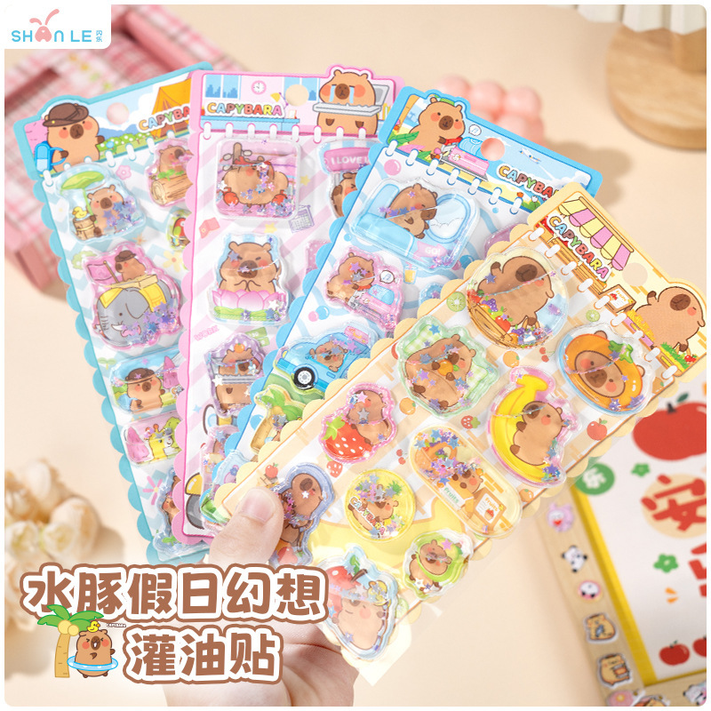Shanle Kapibara 3D 立体オイル充填ステッカー子供用漫画カピバラビーズ付きシェイク水充填オイル充填ステッカー