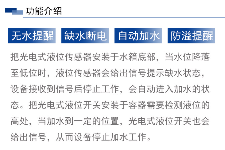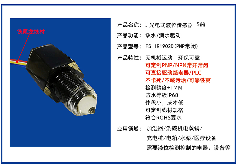 本液位传感器则是采用光学折射原理来判断有水或无水状态,无机械部件运动,因此可靠性高。