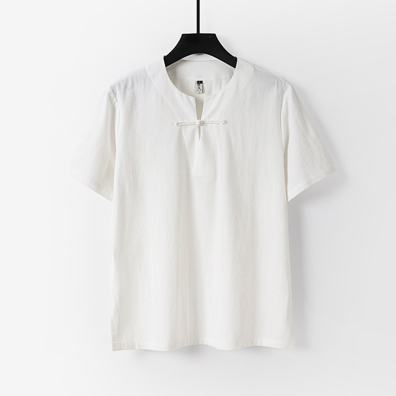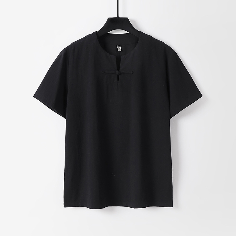 リネン Tシャツメンズ半袖夏ルーズメンズ中国風綿とリネン半袖トレンディな中国風メンズボタンダウントップ