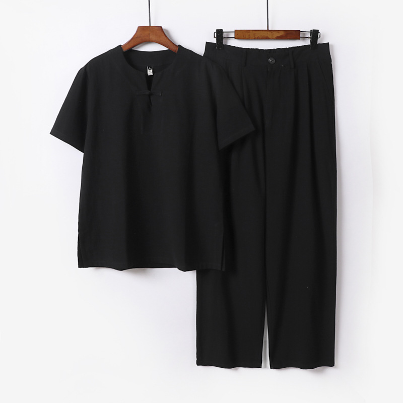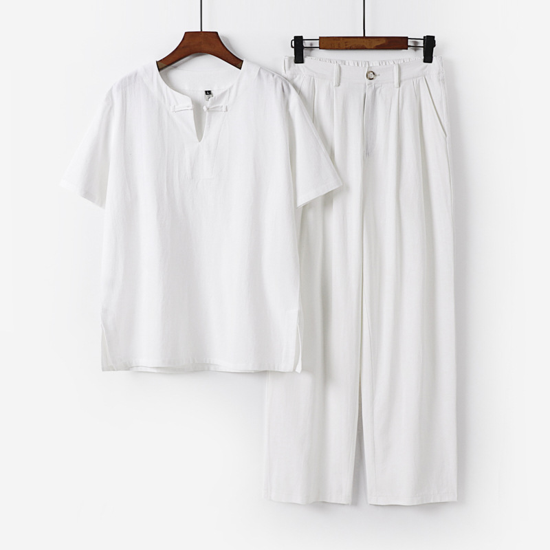 中国風の綿とリネンのスーツメンズ夏ツーピース韓国風リネン七分袖シャツハンサムな服セット男性用