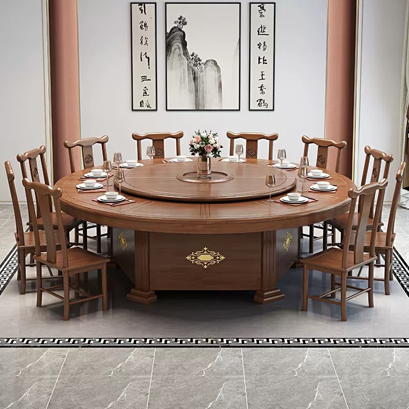 新しい中国風の無垢材のダイニングテーブルホテル商業15人から20人用ロックプレートターンテーブル付き電動大型ラウンドテーブル