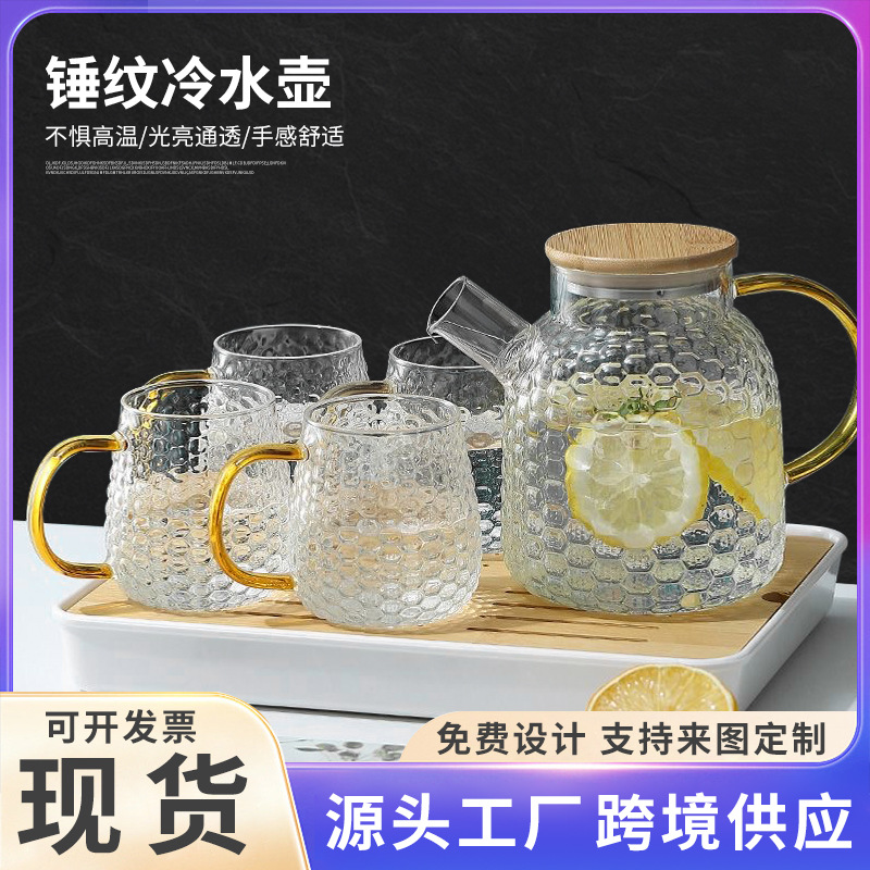 批发锤纹玻璃冷水壶高硼硅玻璃大容量米粒纹凉水壶可加热水杯套装