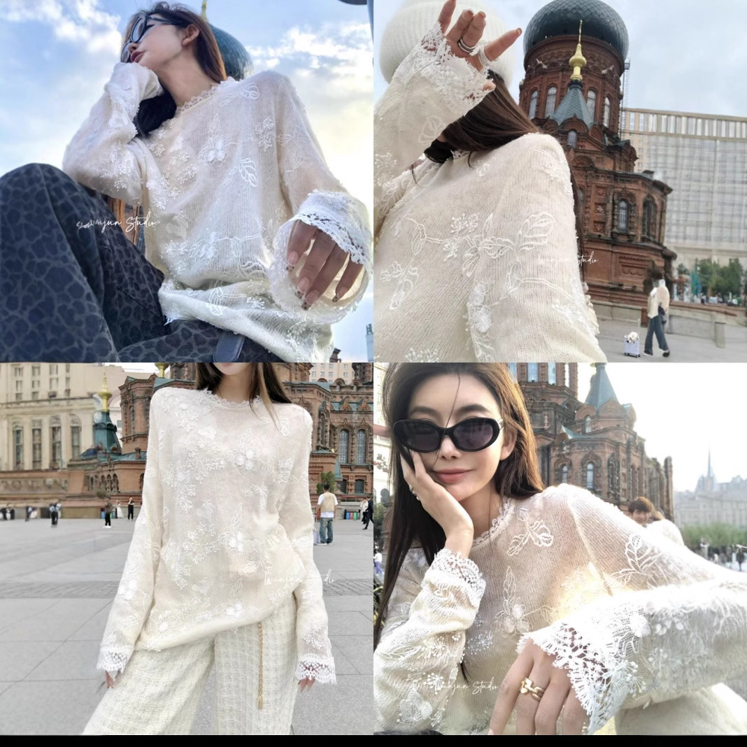 韓国の東大門秋の新作、梨の花柄レース刺繍入り透かし彫り長袖、優しい雰囲気の韓国風インナーウェア