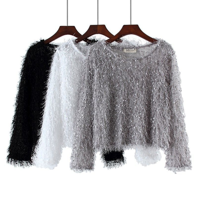 套头流苏上衣秋季新款宽松圆领毛毛亮丝长袖恤打底衫