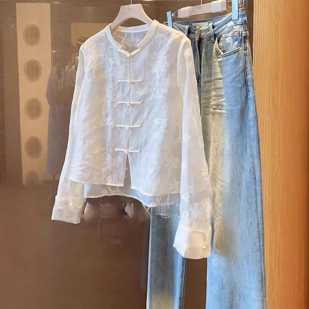 拾い落としコーナーは後単新中国式禅意国風重工刺繍盤ボタンの薄いシルクの長袖シャツの女性を撤回します。