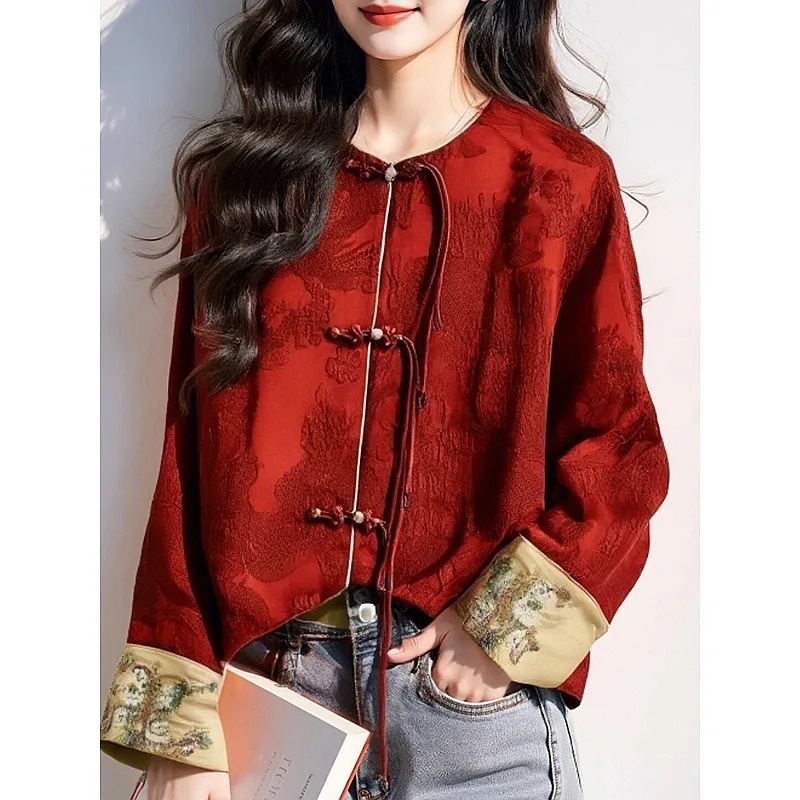 新しい中国風の女性の中国風の赤いボタンタッセルジャケット女性のための春の新しい小さな香りのジャカードトップ