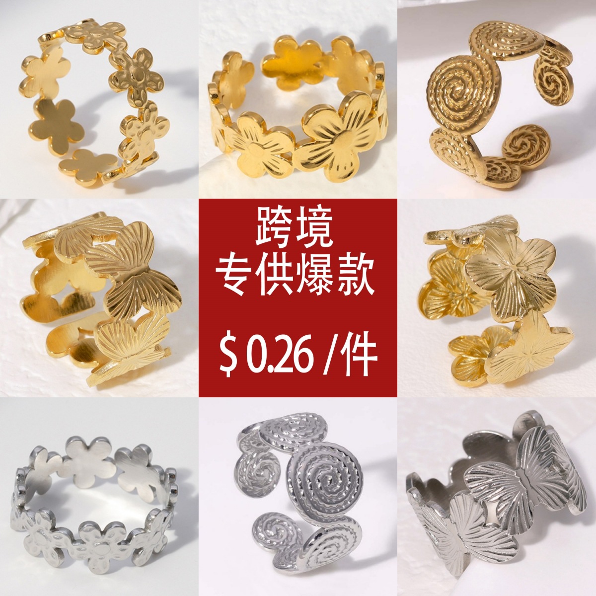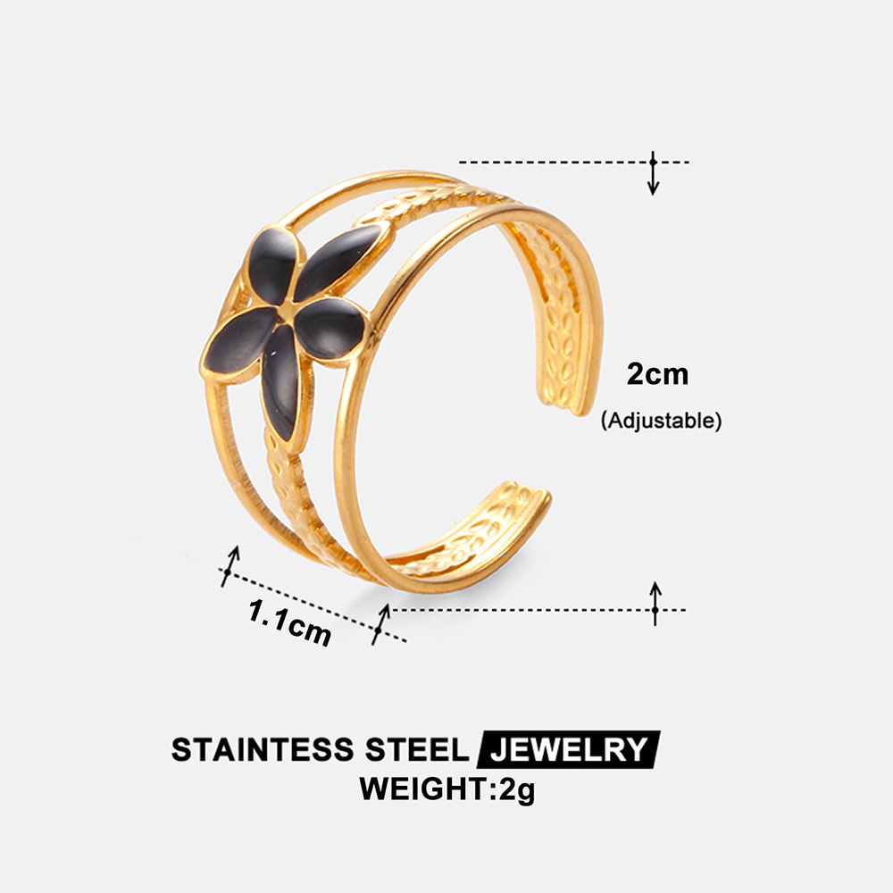 欧美时尚简约花朵不锈钢戒指真空电镀18k金滴油钛钢开口指环首饰