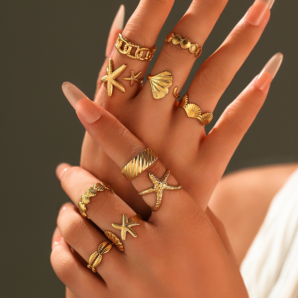 ヨーロッパとアメリカのトレンディなホリデーシーシェルヒトデ誇張ステンレス鋼リング女性用非退色 18K ゴールドジュエリー
