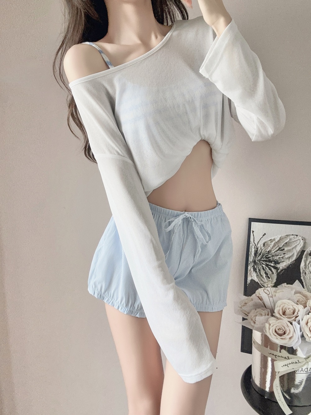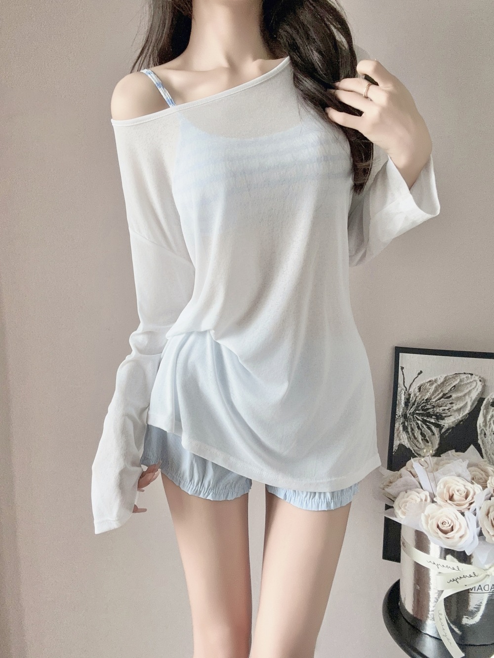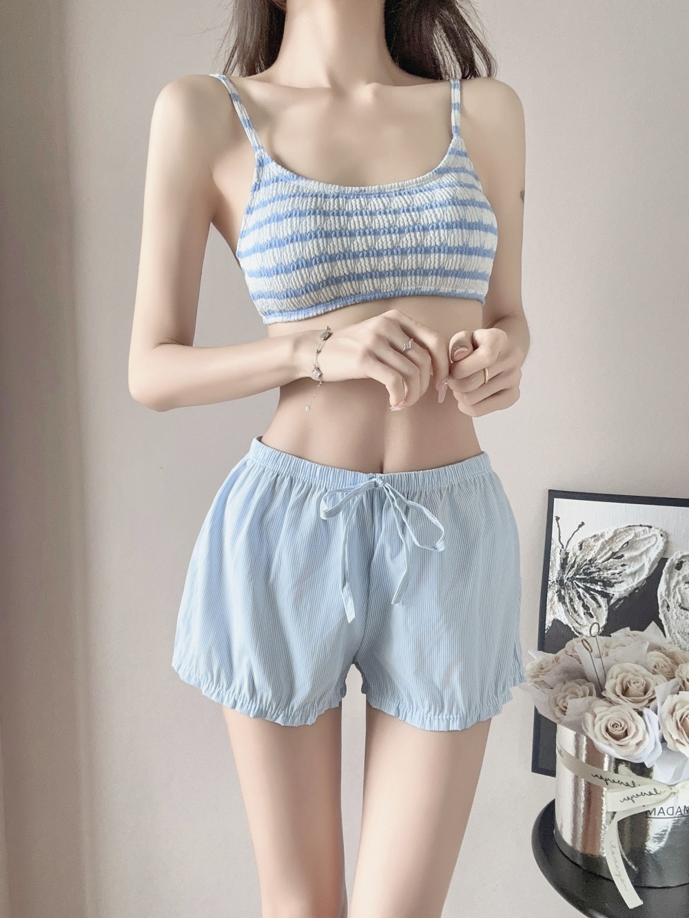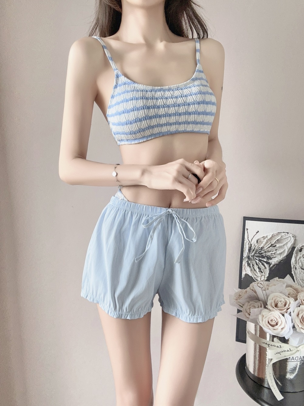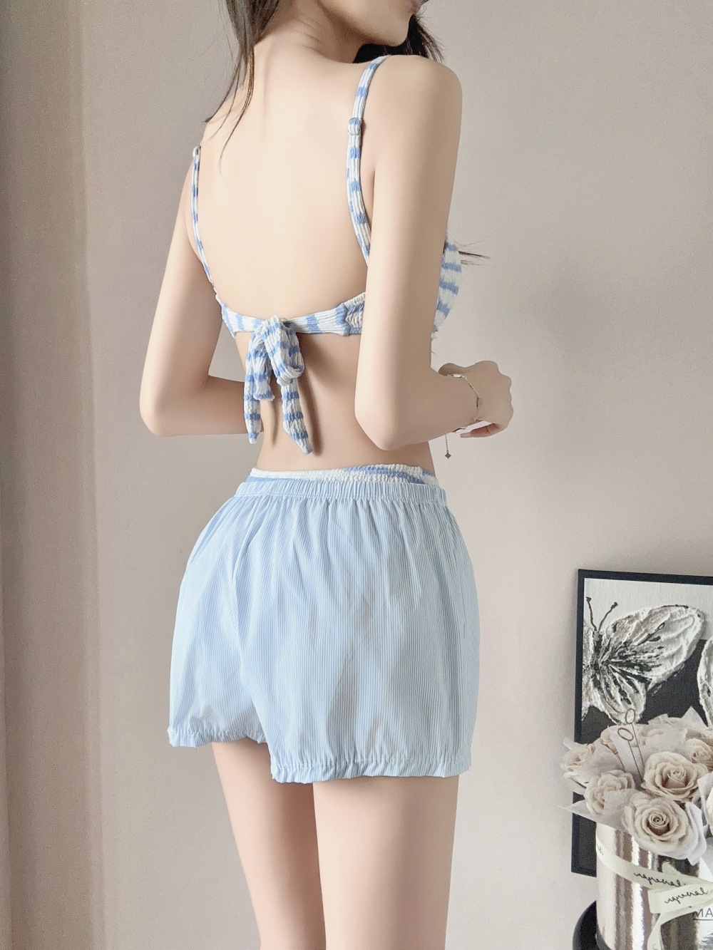 ブルーストライプビキニ,ビキニ+ショートパンツ,ビキニ+ショーツ+シャツ,ブルーのストライプのショートパンツ,アウターシャツ