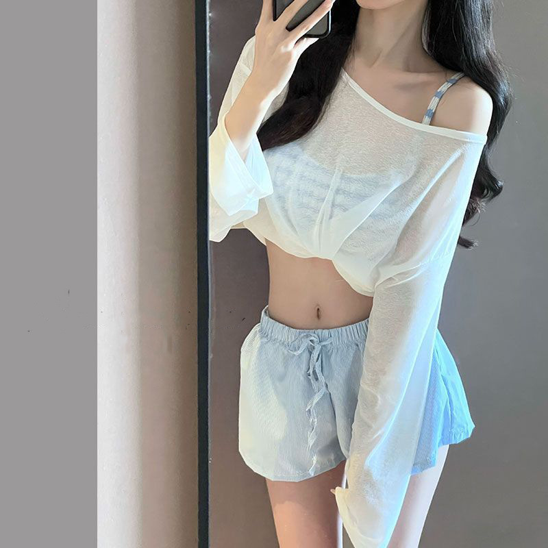 ストライプ欧米セクシービキニリゾートビーチゆったりストライプショートパンツ外着可能BM風スプリット水着ins