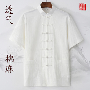 中国風リネン唐スーツ男性中高年夏半袖シャツスーツ綿とリネンおじいちゃんお父さん夏服漢服
