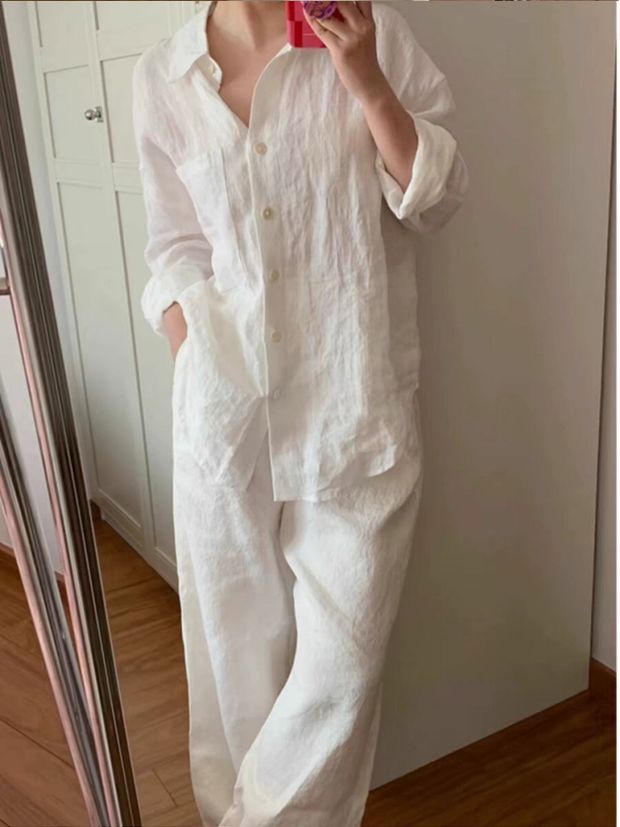 颜色 棉麻长袖工装衬衫 白色,棉麻长袖工装衬衫 黑色,棉麻长袖工装衬衫 藏蓝,下搭亚麻长裤 白色,内搭纯色短t 白色