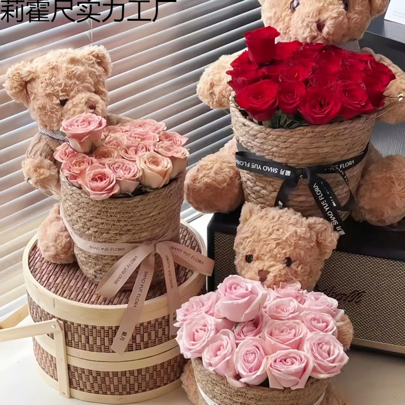テディベア、プリザーブドフラワー、ソープフラワー、セーター、ベアハグ、花束、ハグバケツ、女の子用ギフトバッグ