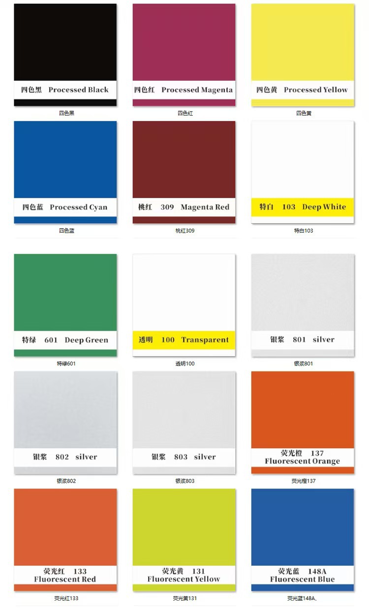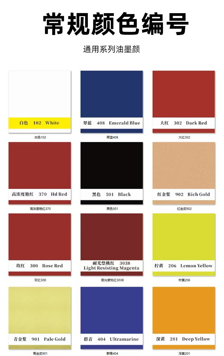 规格 102白色,501黑色,302大红,203原黄,403蓝色,100透明油,601绿色,201深黄,300玫红,4010紫色,802银色,901青金,902红金,306桔红,103特白,105高度浓白,801银色,102白色-5KG包装/桶,501黑色-5KG包装/桶,荧光绿,桃红,荧光桃红,黑/白样品200g,红/黄/蓝/绿样品200g
