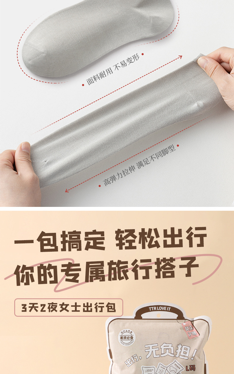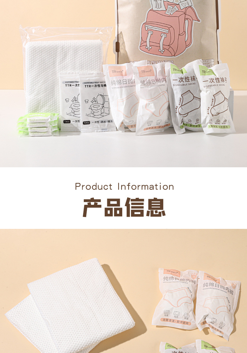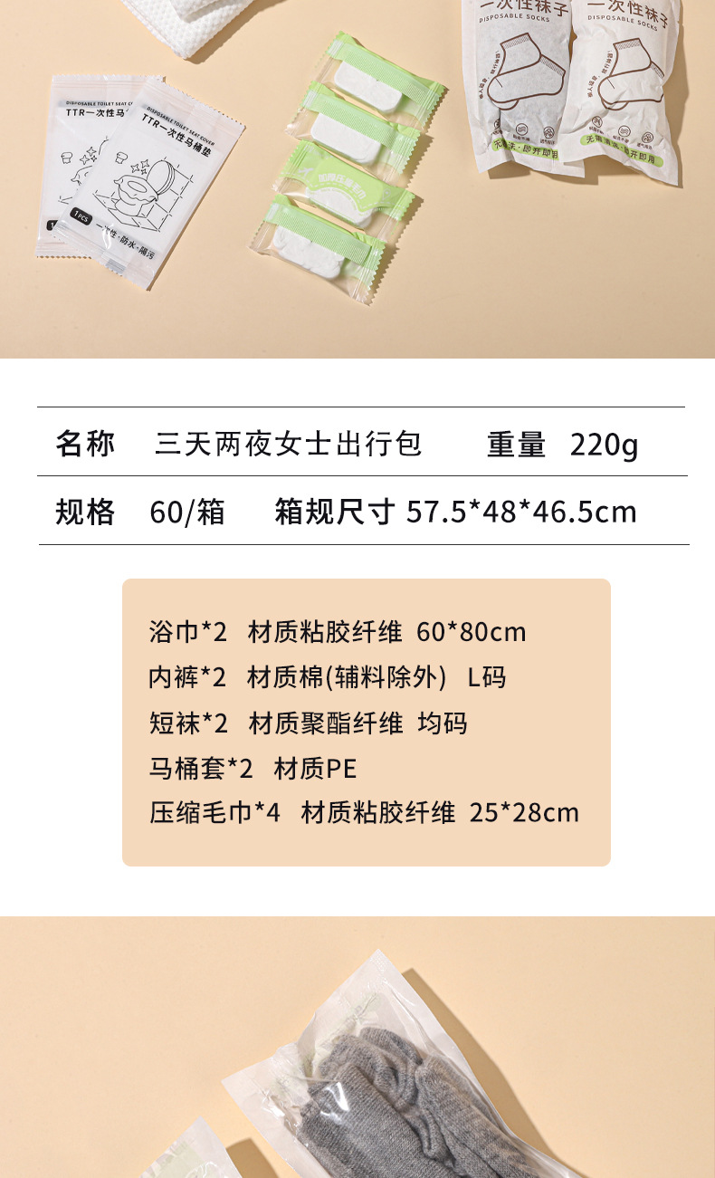 女性用2泊3日旅行バッグ、アウトドア使い捨て用品セット、トイレマット、ボートソックス、バスタオル、圧縮タオル、下着