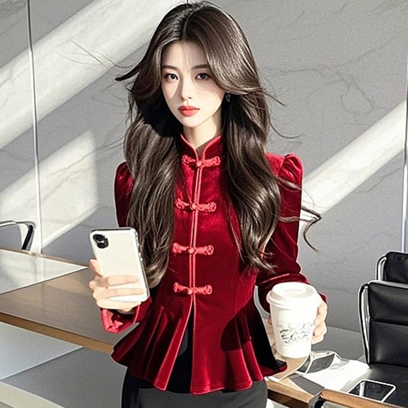 ライトラグジュアリーハイエンドレッドベルベット長袖シャツ女性のための 2024 冬の新しい中国風スリムフレンチピンチウエストトップ