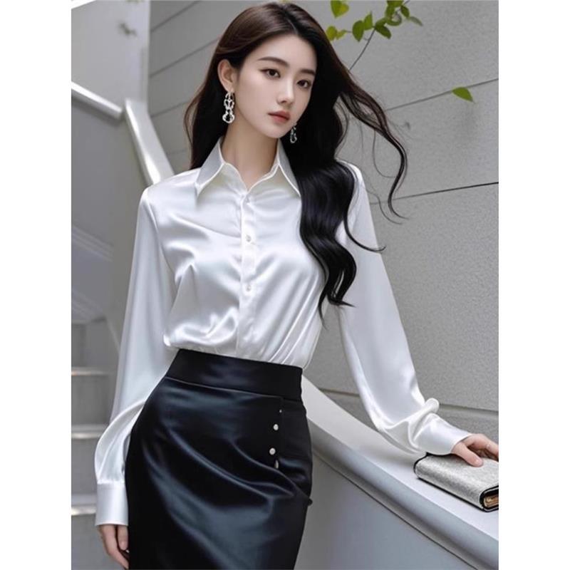 2024 秋の新ハイエンドヘビーアセテートサテンシャツ女性の長袖多用途プロフェッショナルルーズフォーマルシャツ