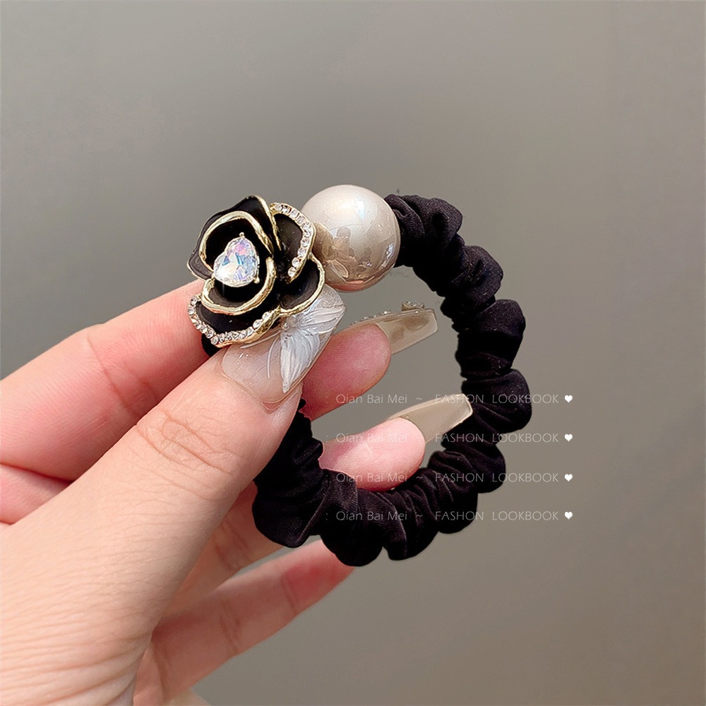 黑色小香风发圈女扎发皮筋山茶花珍珠闪钻肠圈高级感头绳气质发绳