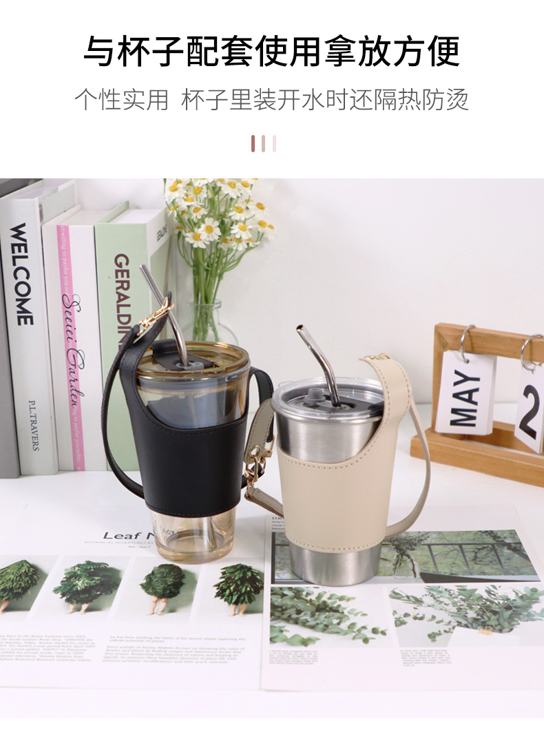 グラスストローカップ手持ち革カップセット女子高級颜値コーヒーカップ携帯カップセット