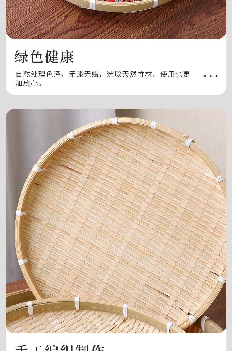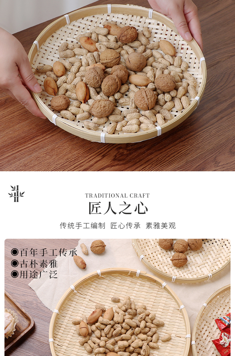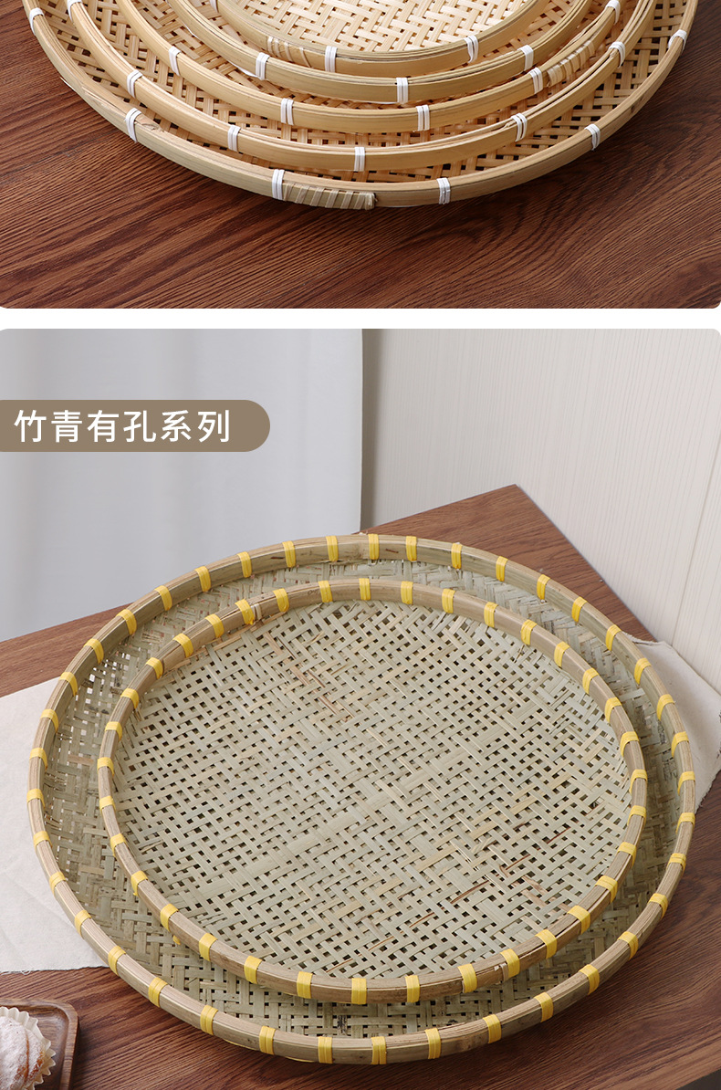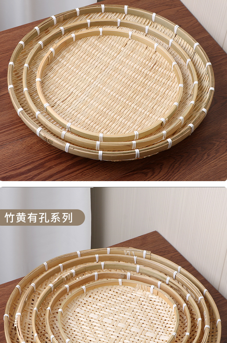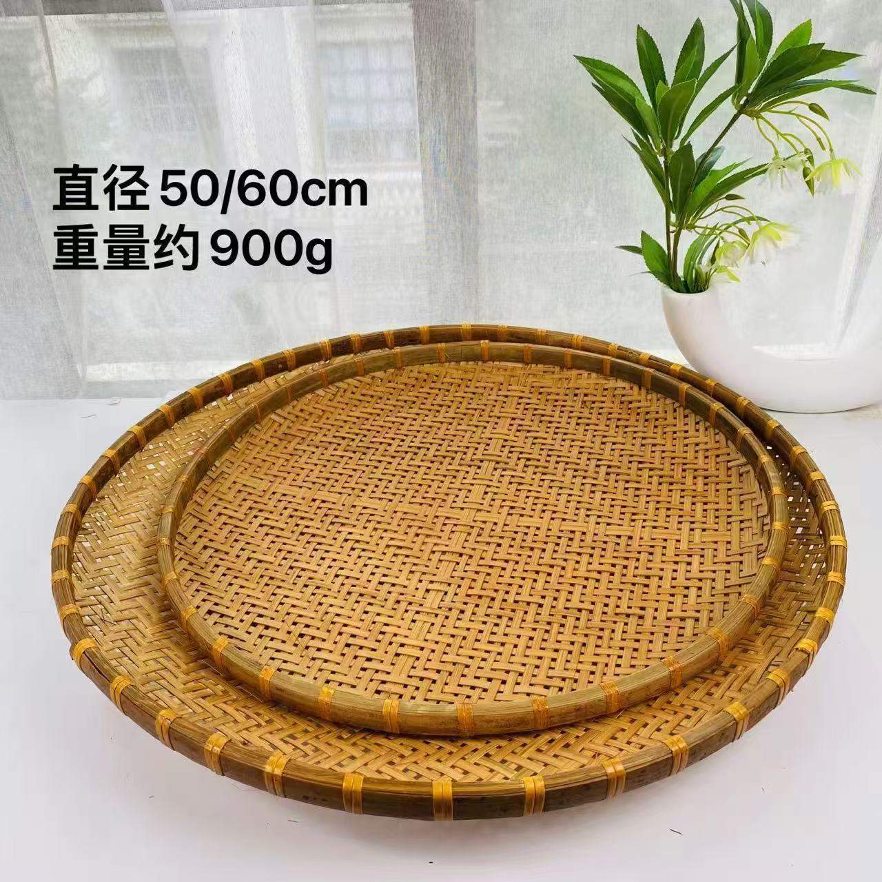 家用晒干货装饰晾晒筐盘圆形大尺寸簸箕竹筛子无孔竹皮竹编制品