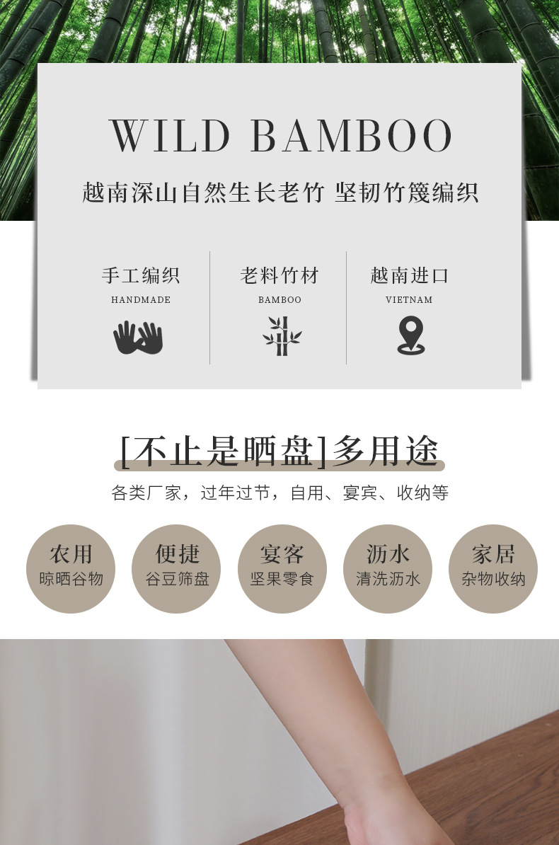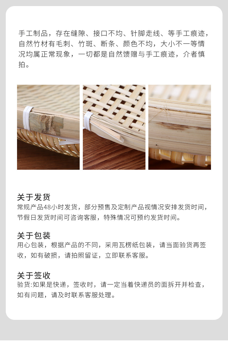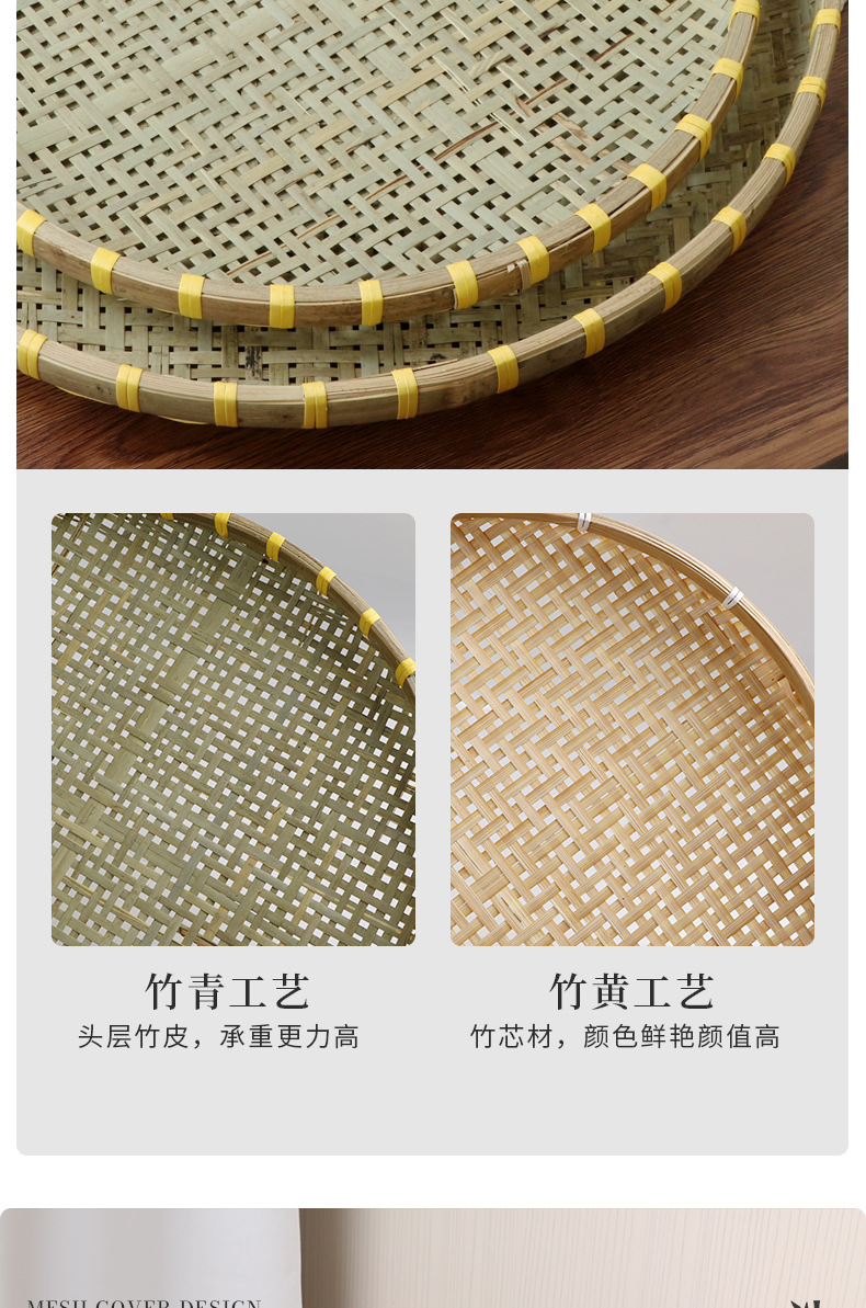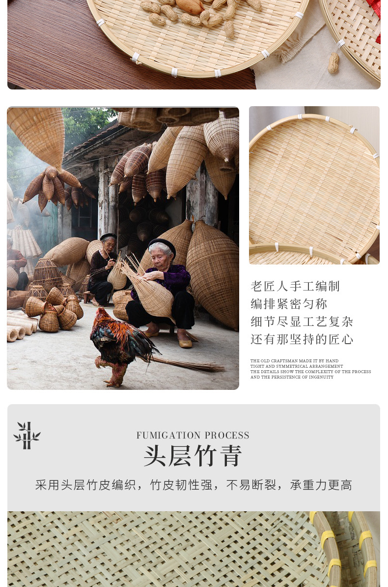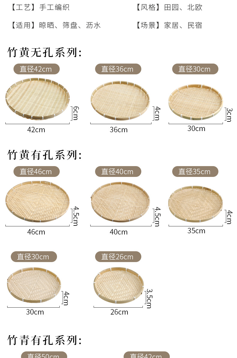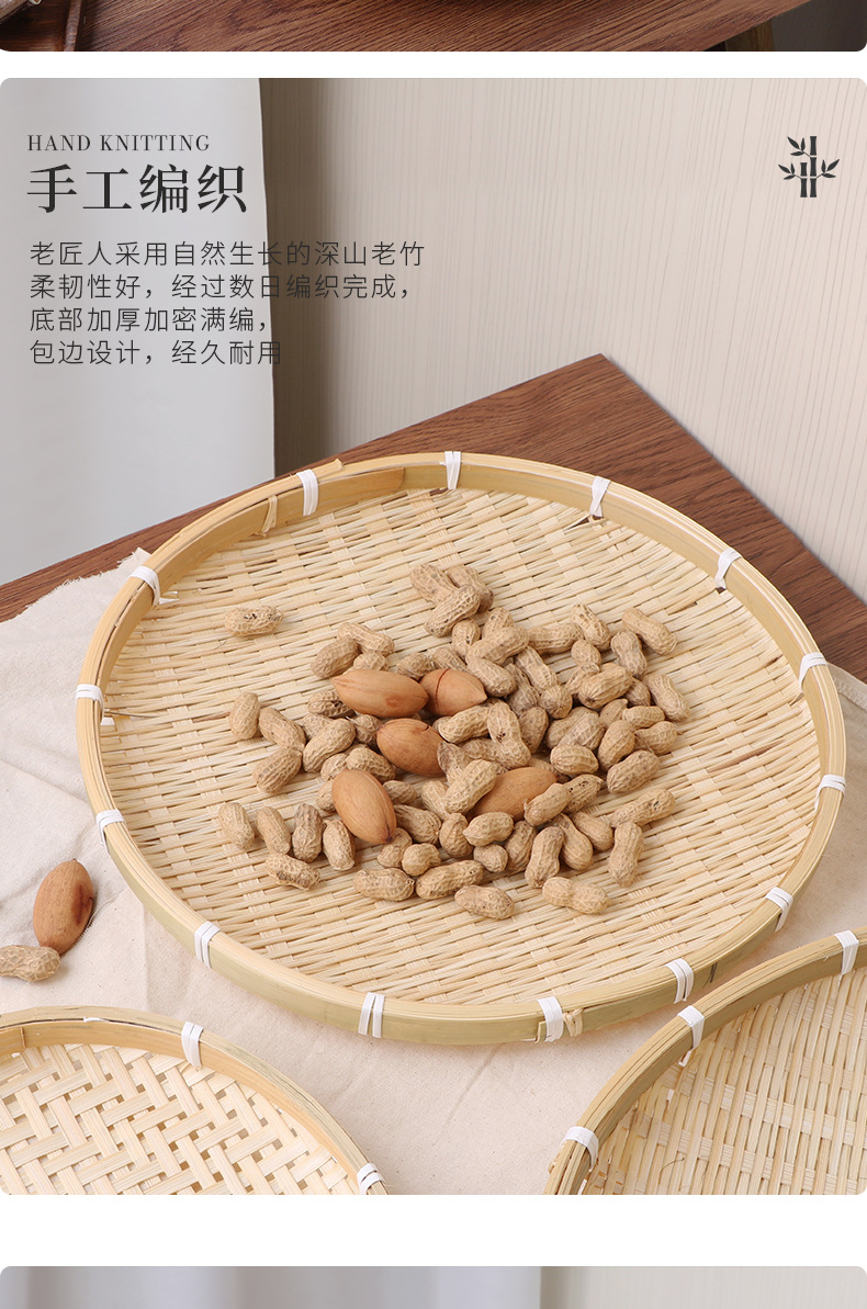 家用晒干货装饰晾晒筐盘圆形大尺寸簸箕竹筛子无孔竹皮竹编制品