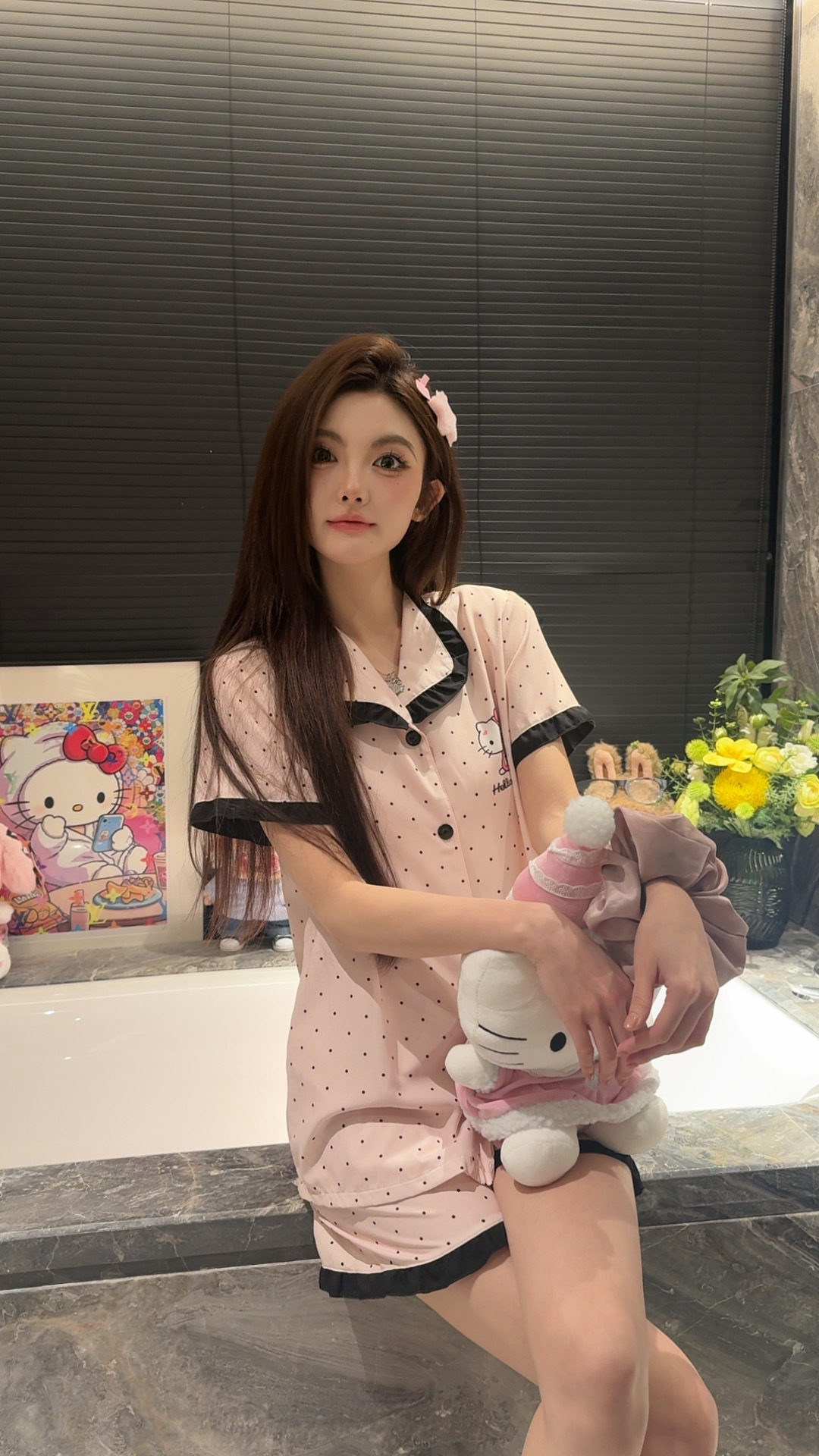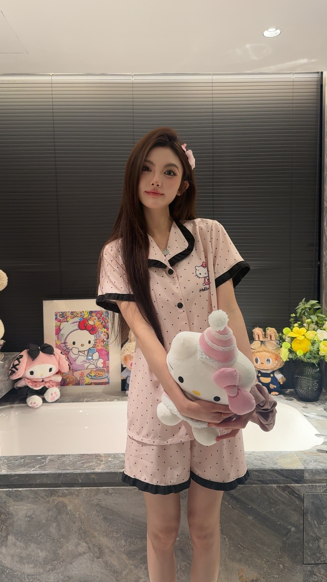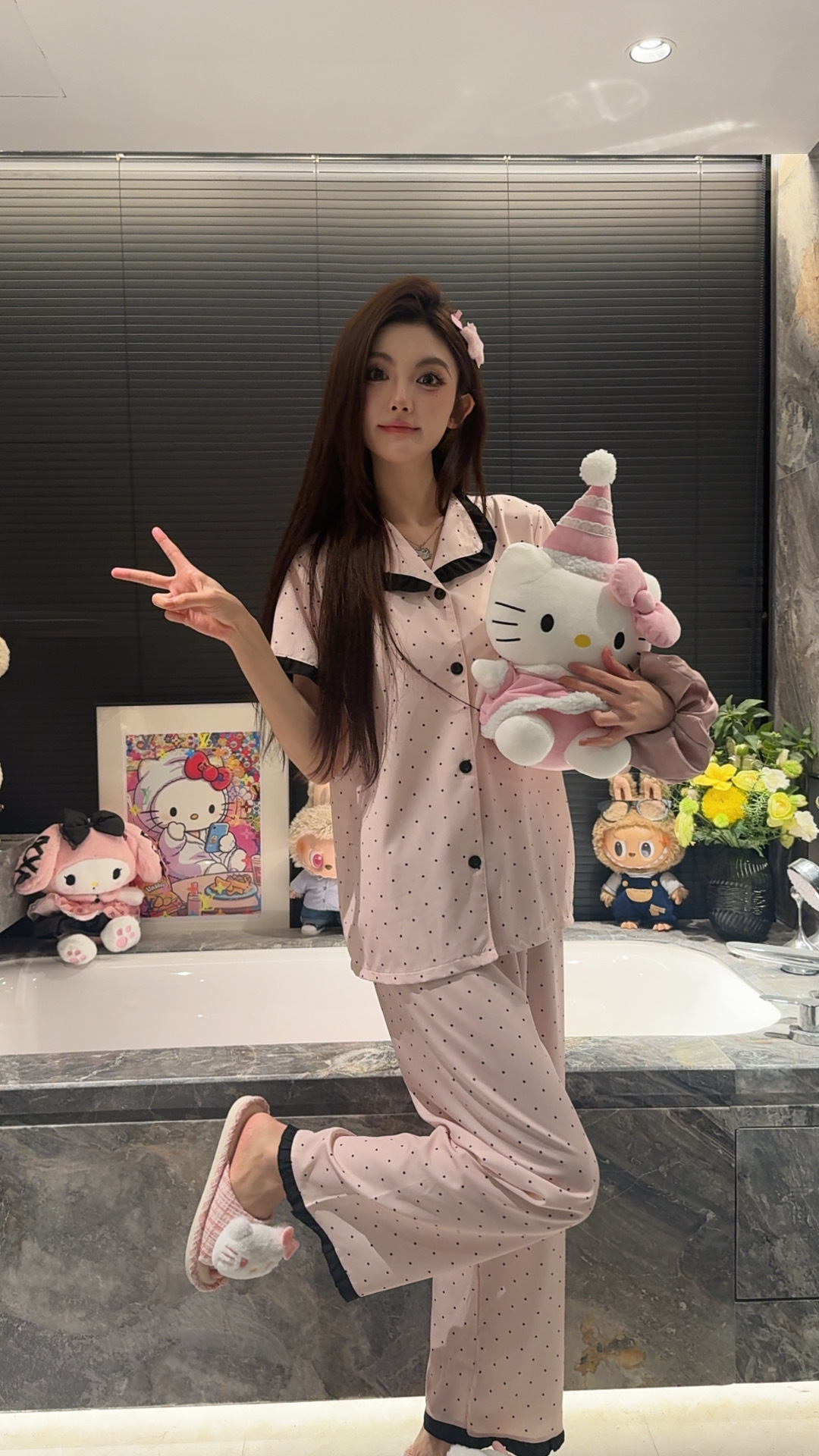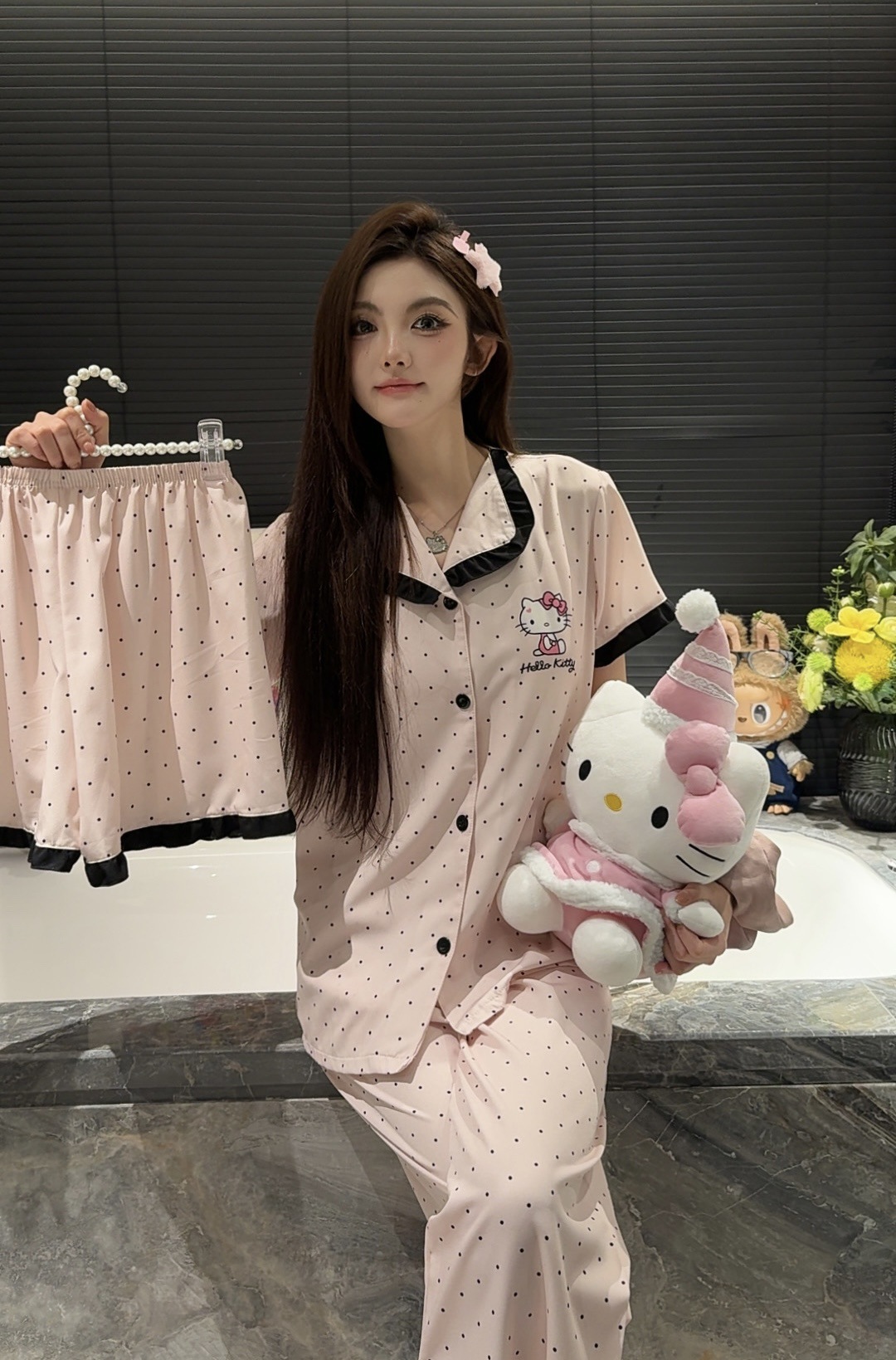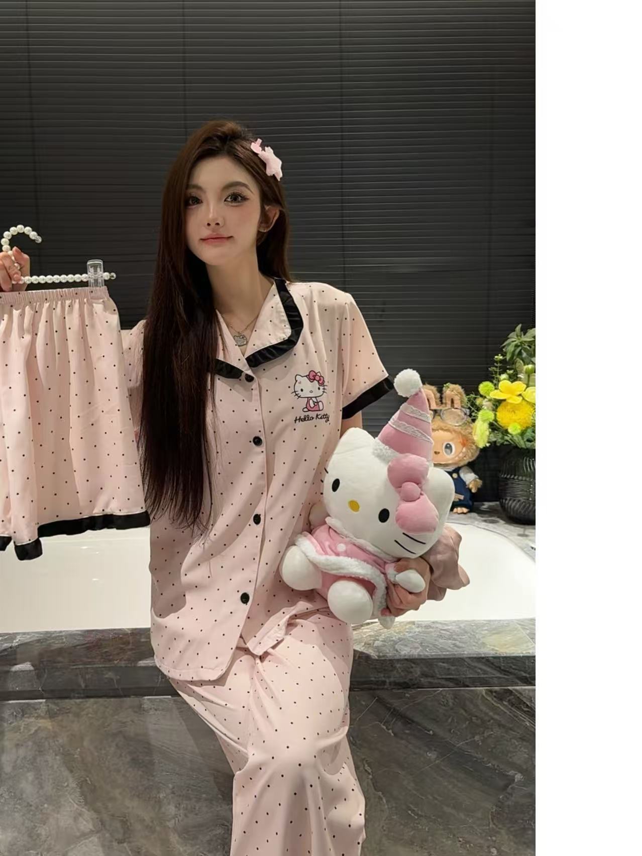 冰雪丝三件套装夏季新款甜美可爱波点kt猫开衫翻领家居服女可外穿