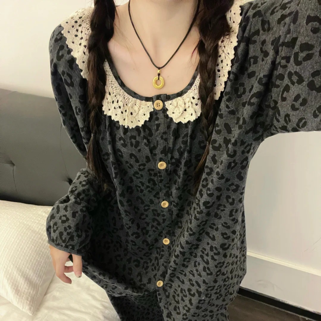 德绒睡衣女秋冬新款蕾丝花边豹纹灰色娃娃领公主风花边家居服套装