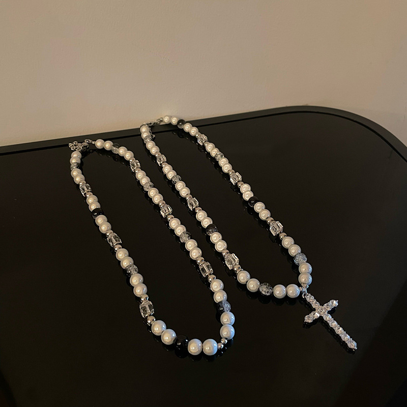 反光珍珠拼接十字架小众设计锁骨链钛钢项链男欧美嘻哈风女毛衣链