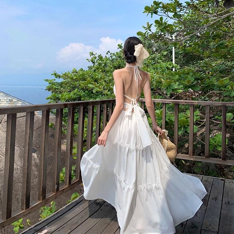 夏の三亜旅行服、写真撮影用ロングスカート、背中の開いた海辺のリゾートスタイルのビーチスカート、スーパーフェアリーサスペンダードレス