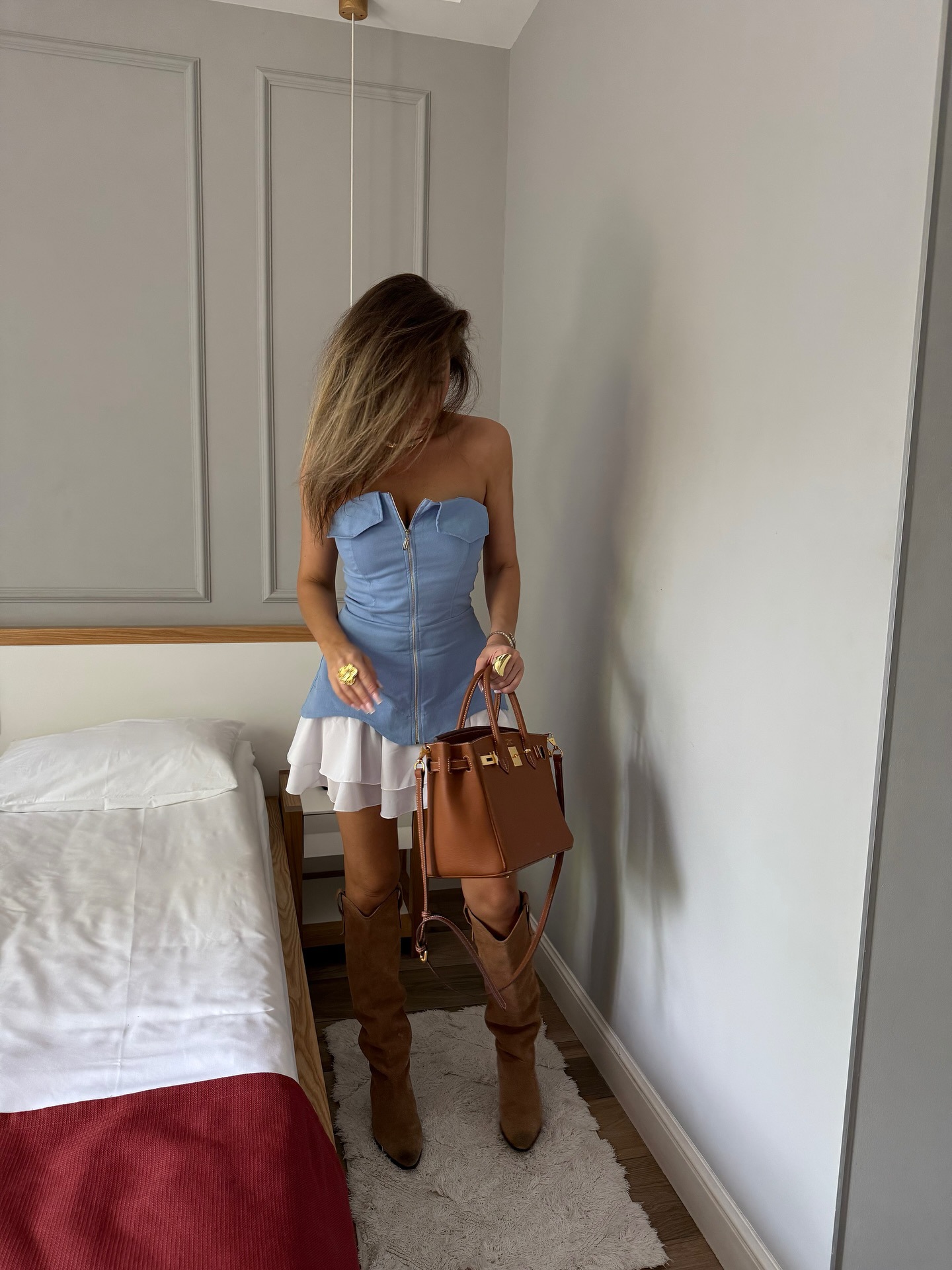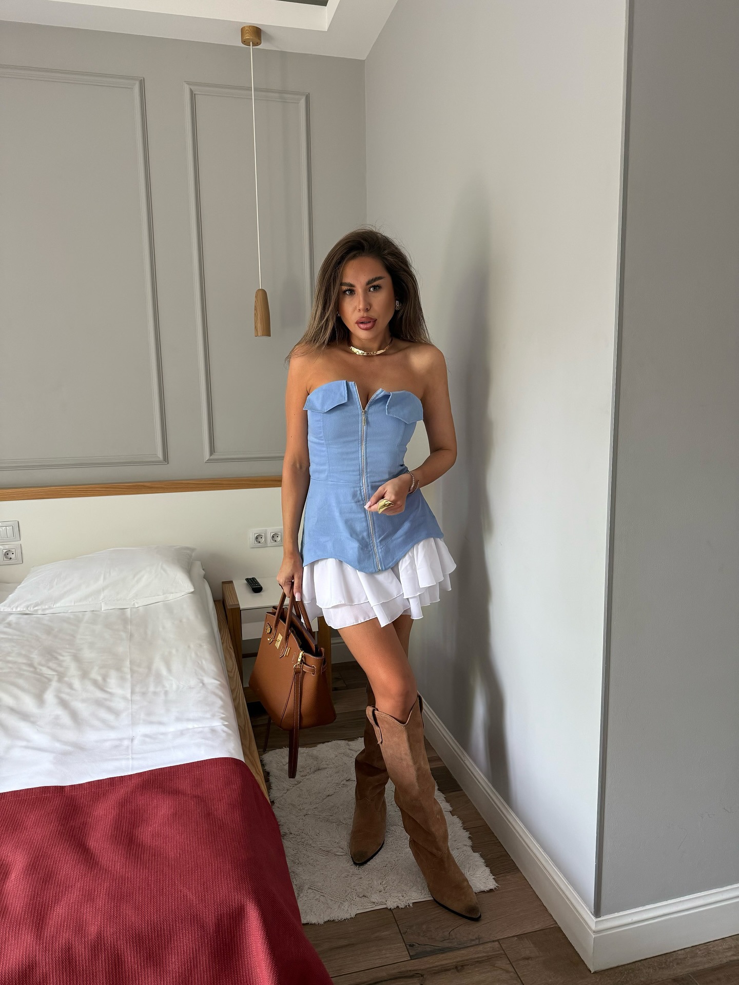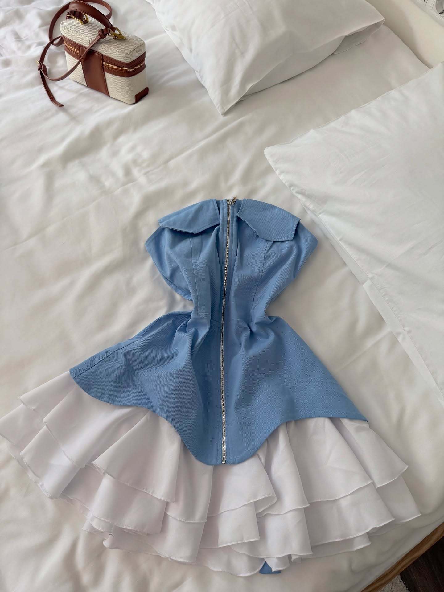 ヨーロッパとアメリカのクロスボーダー婦人服 2025 夏の新しいホットガール V ネックリボンブルーハイウエスト A ラインサスペンダードレス
