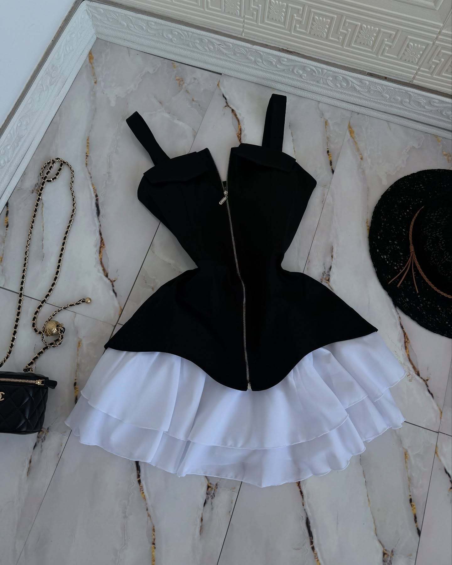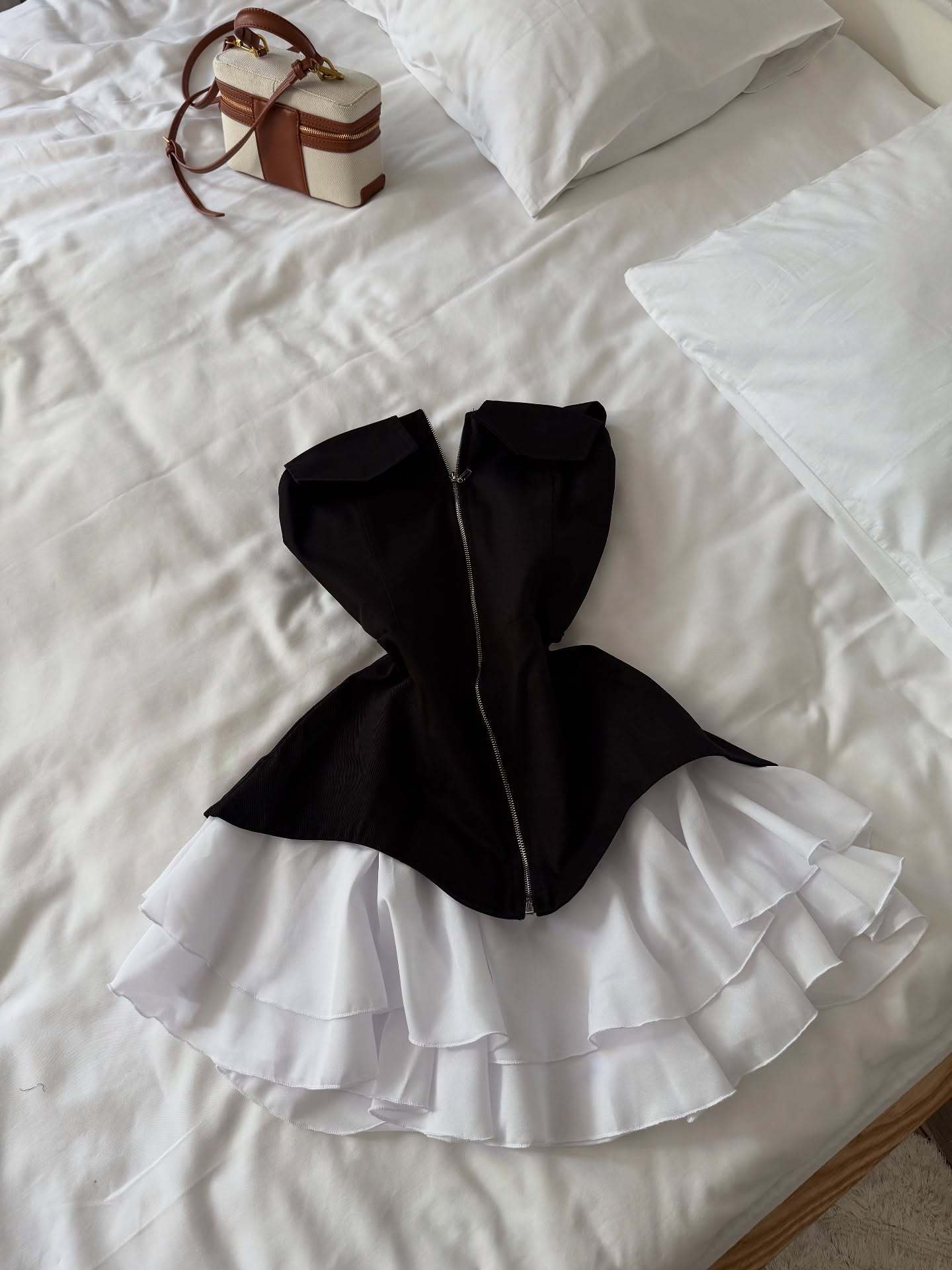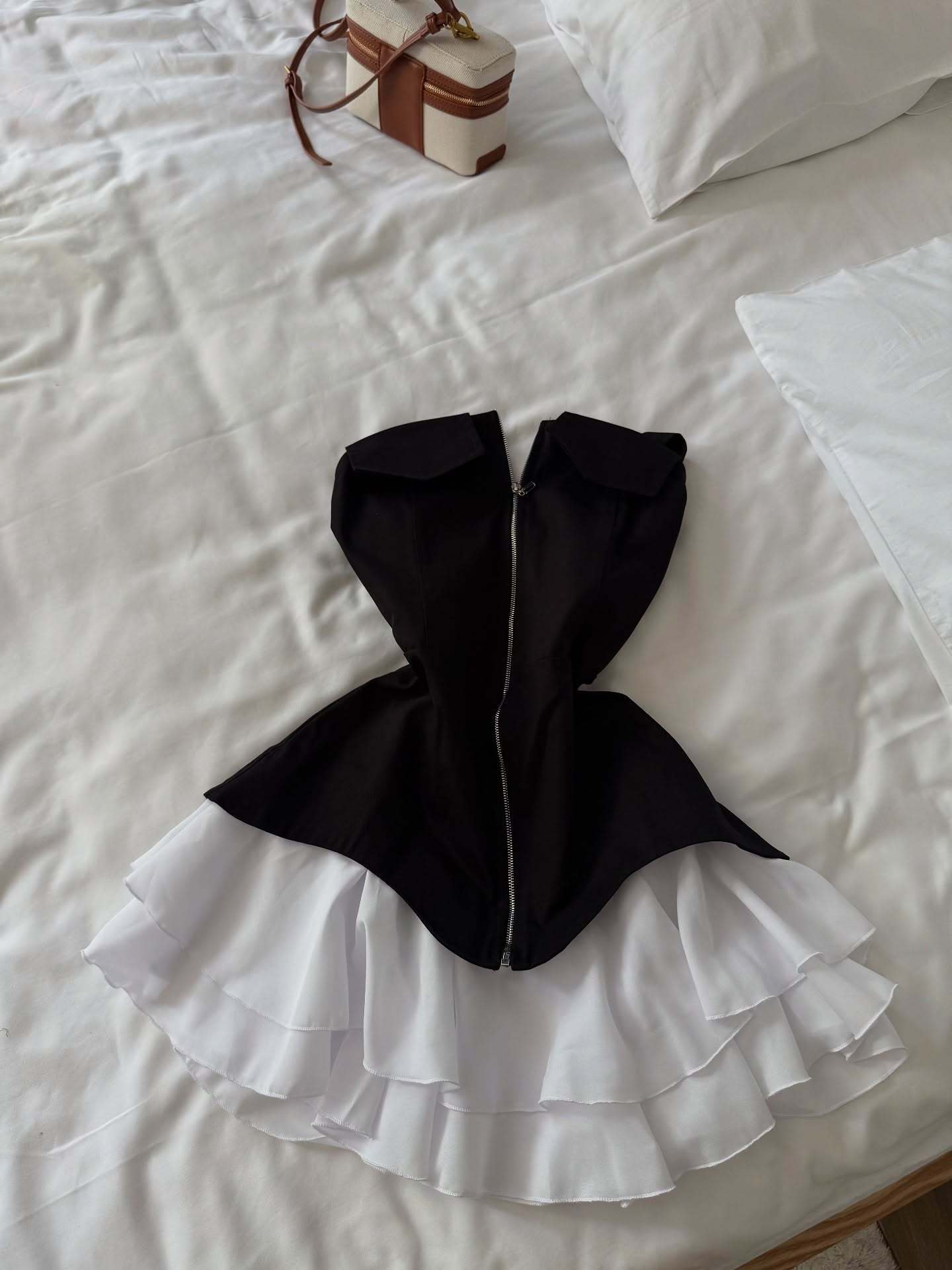 2025春秋新型フランス白黒衝突色子供襟ショートワンピース女性気質優雅しわa字スカート