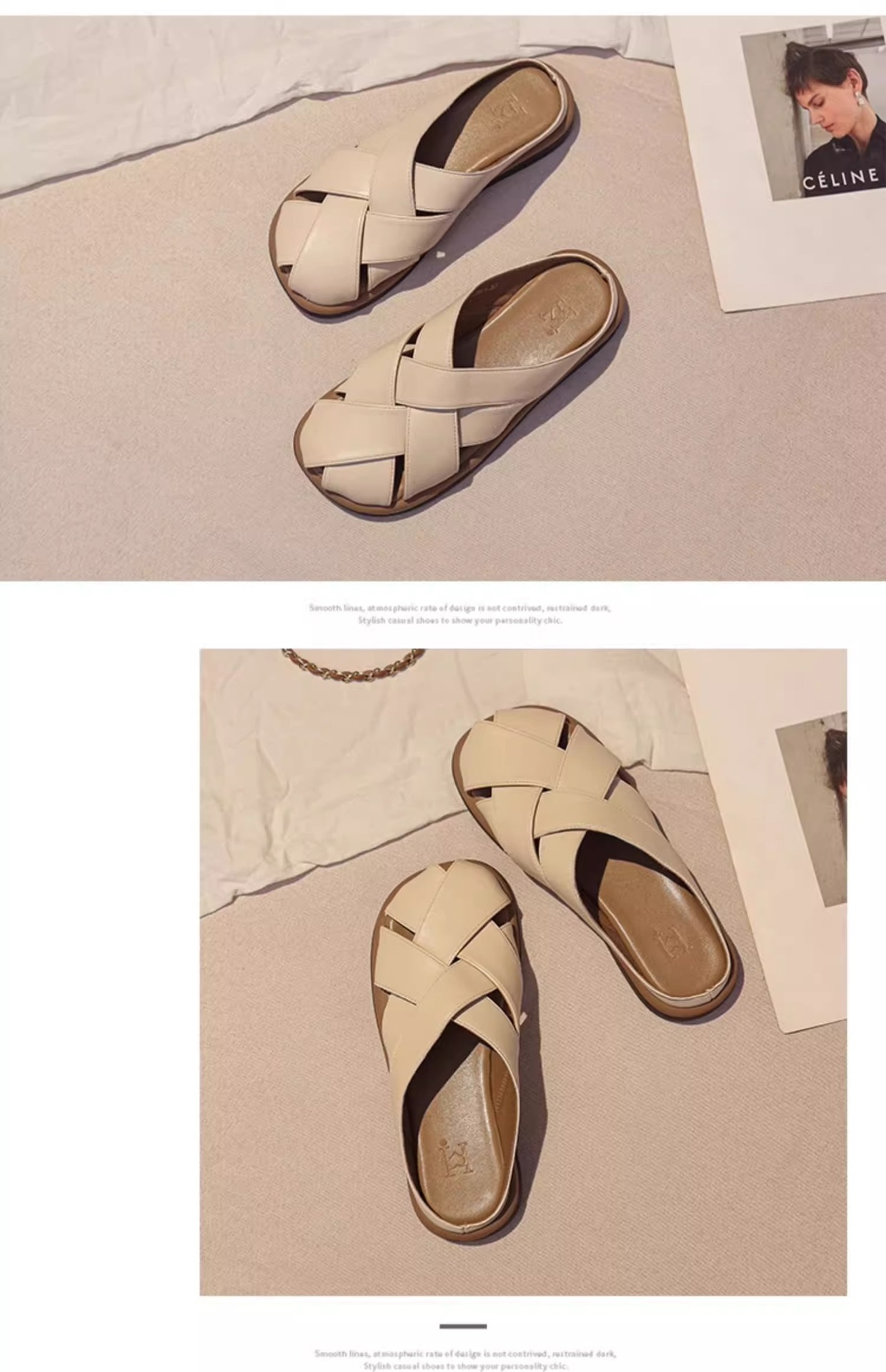 本物のソフトレザーレディース包頭ハーフスリッパ女性の夏のアウターウェアハーフスリッパ妖精スタイルフラットスリッポンミュールシューズ