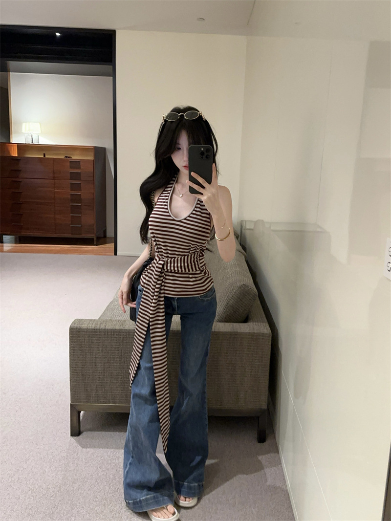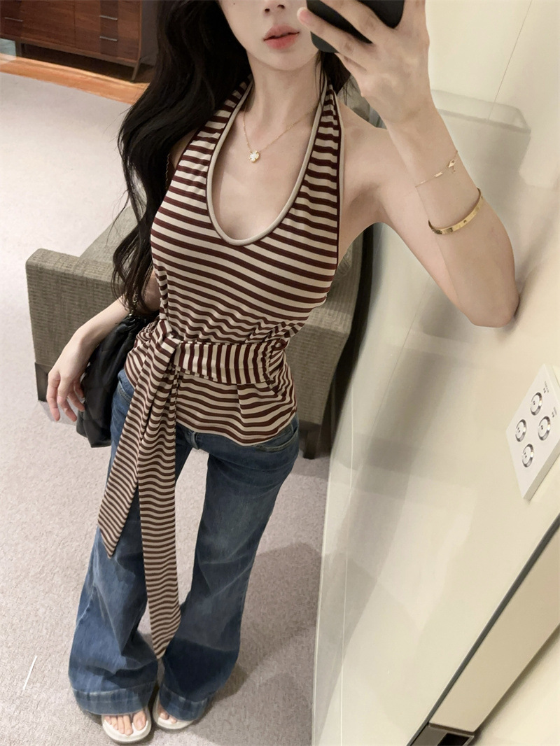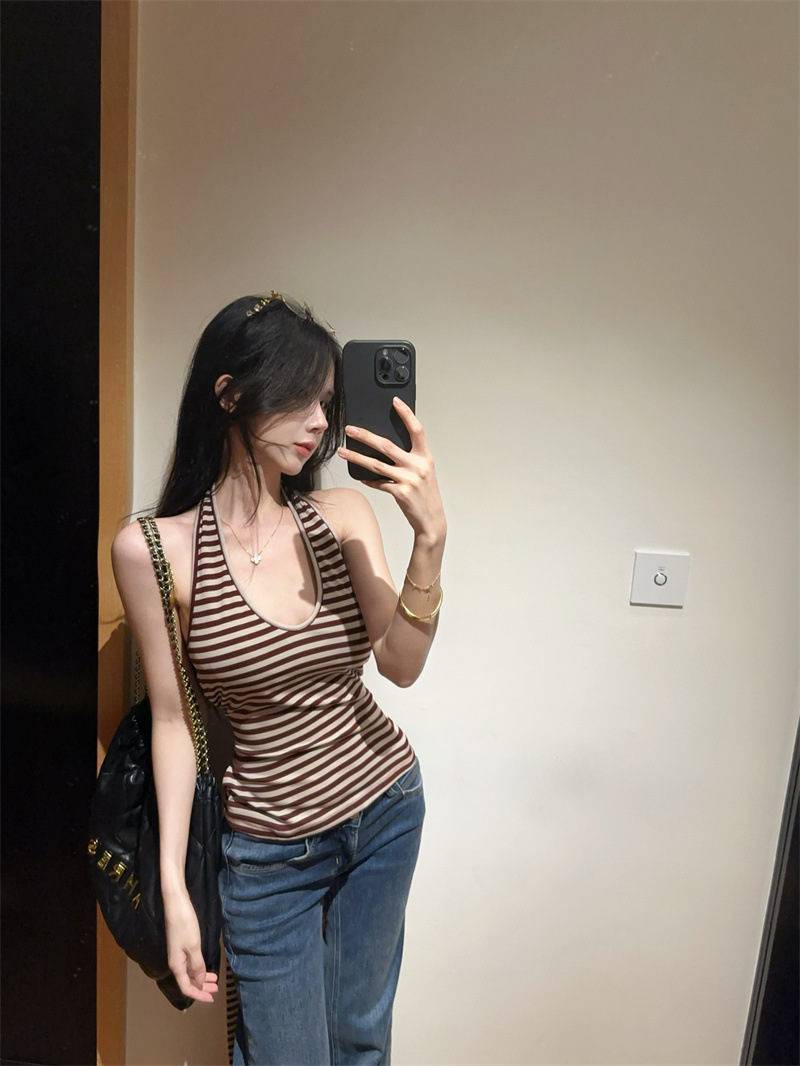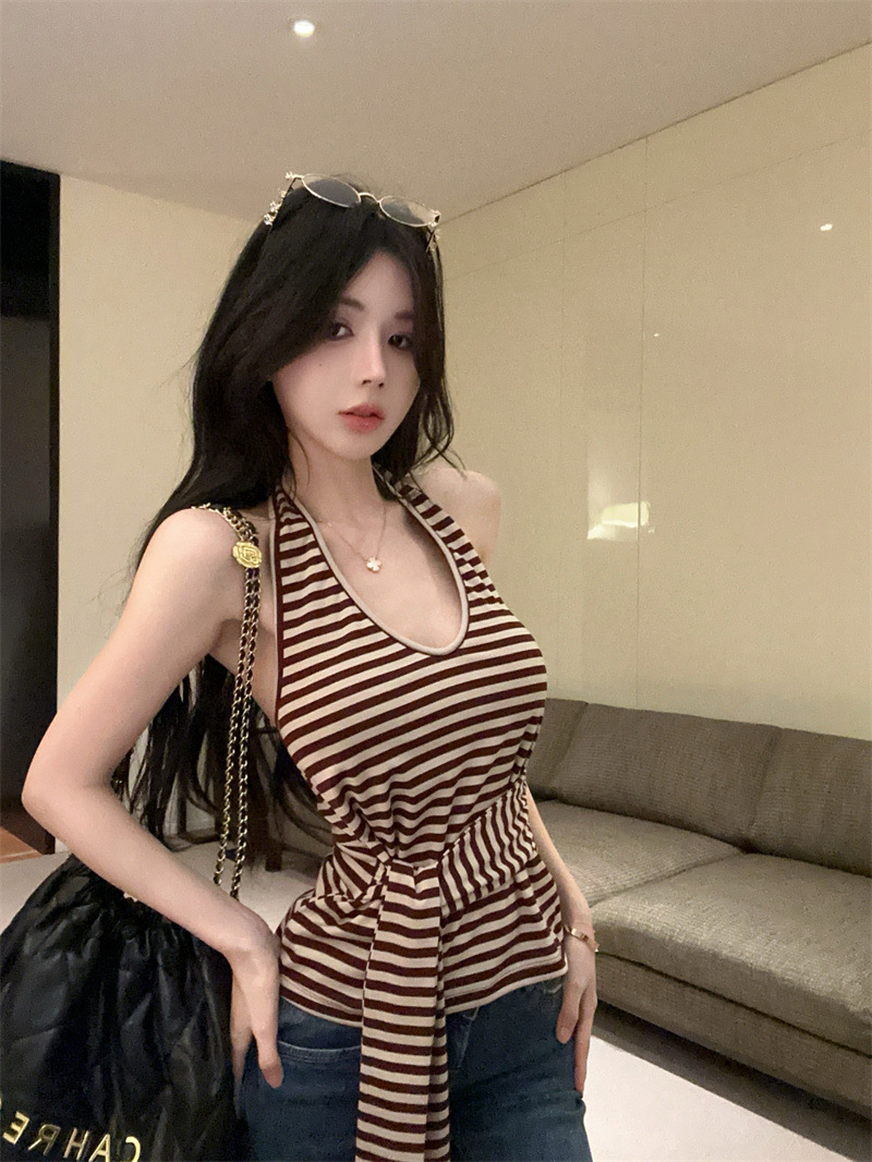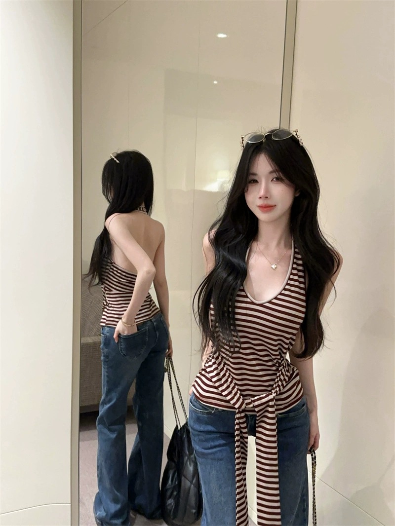 セクシーな季節のチューブトップストライプキャミソールレディース夏Vネックユニークなタイ風ホットガールタイ風美しい小さなホルターネック