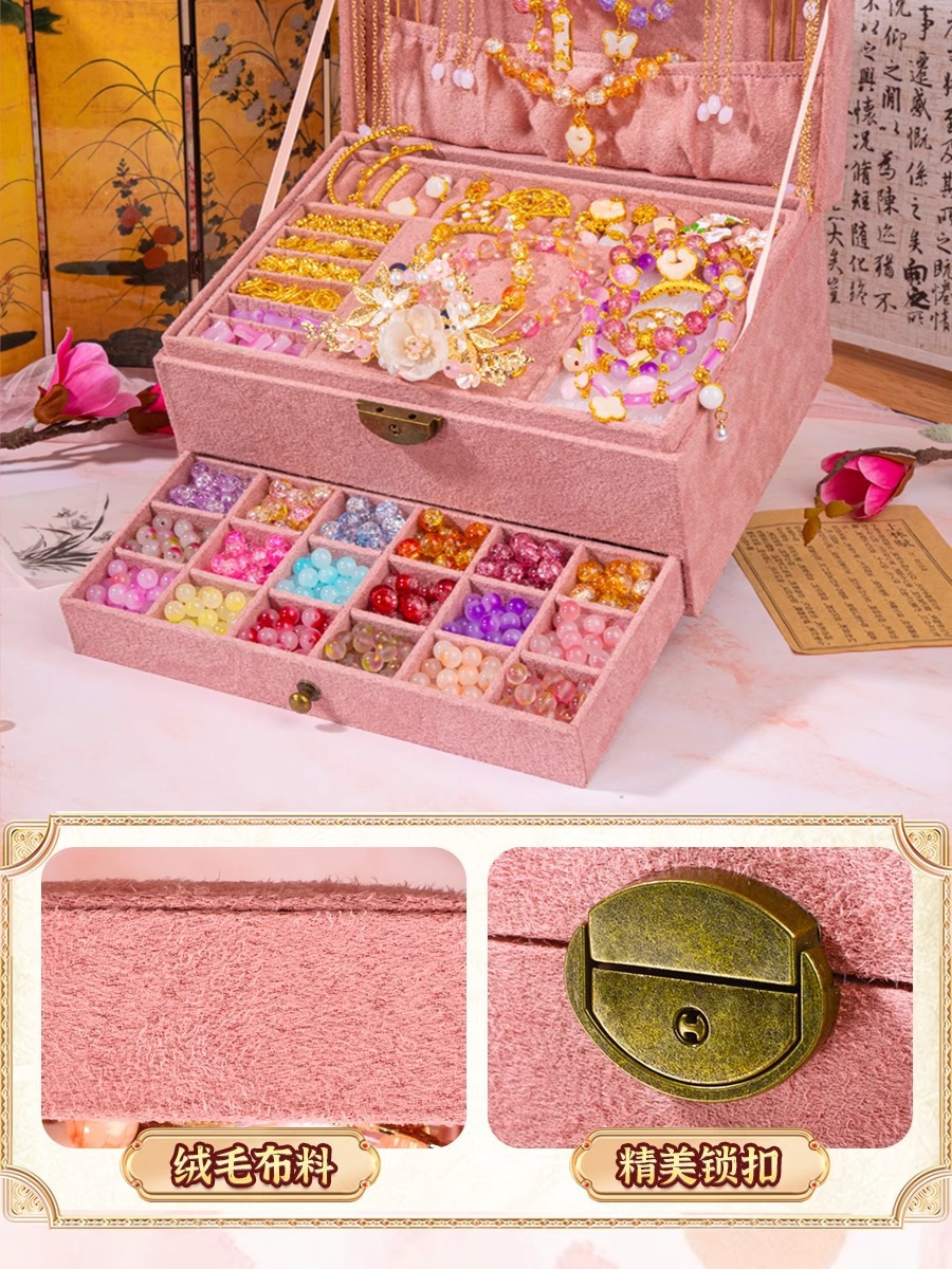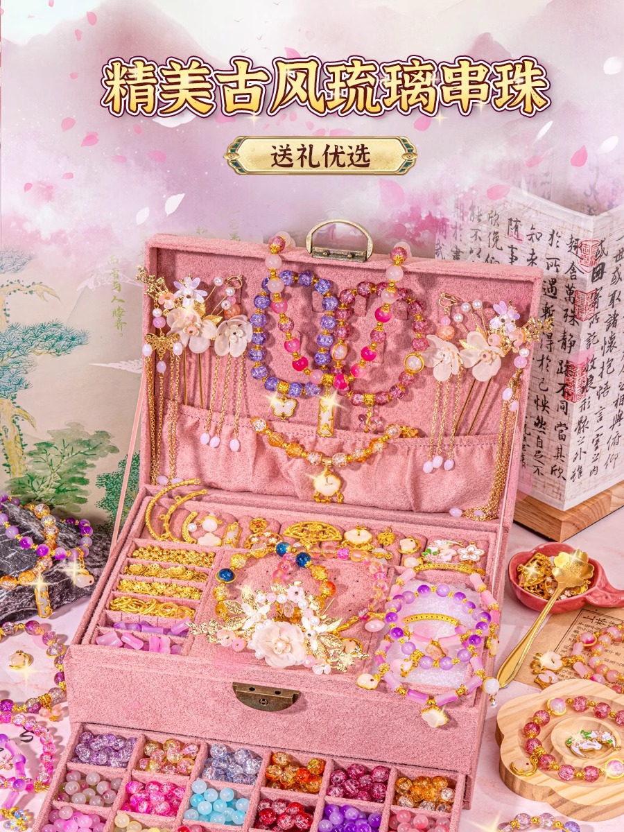 古代風ピンクビーズギフトボックス、ガラスクリスタルビーズ、女の子の誕生日プレゼント、DIYブレスレット、手作り素材ギフト