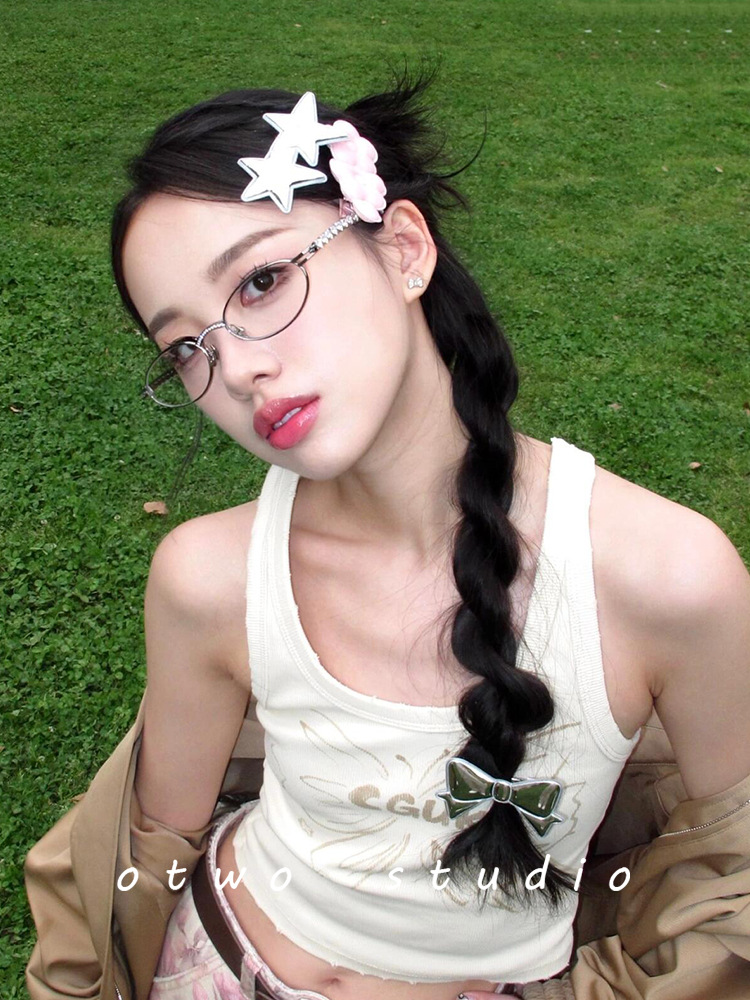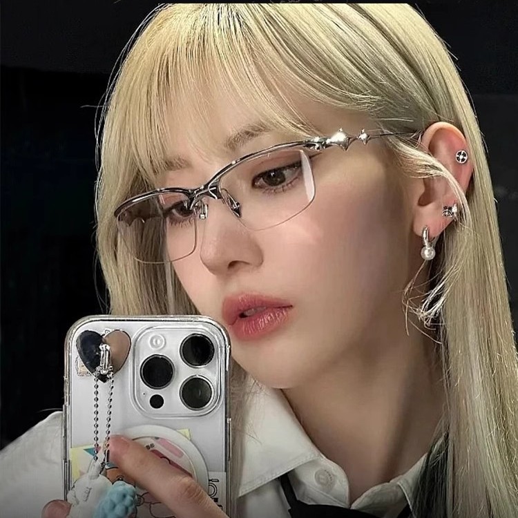 ハイセンスシルバーハーフフレームメガネ、甘くてクールなY2Kホットガールノーメイクフラットミラー、ヨーロッパとアメリカのインキャットアイレトロメタルフレーム