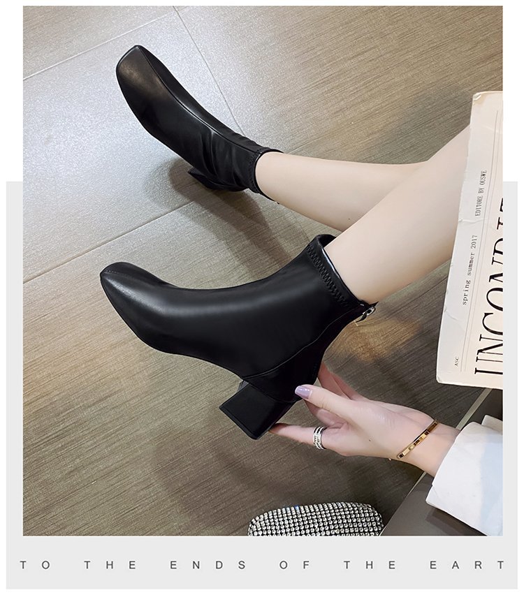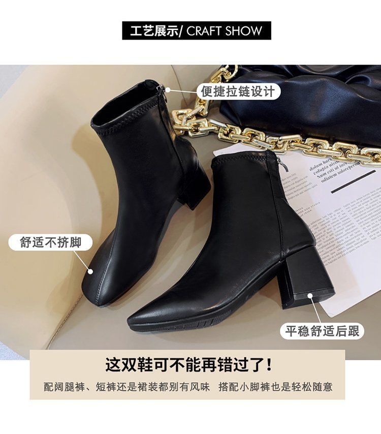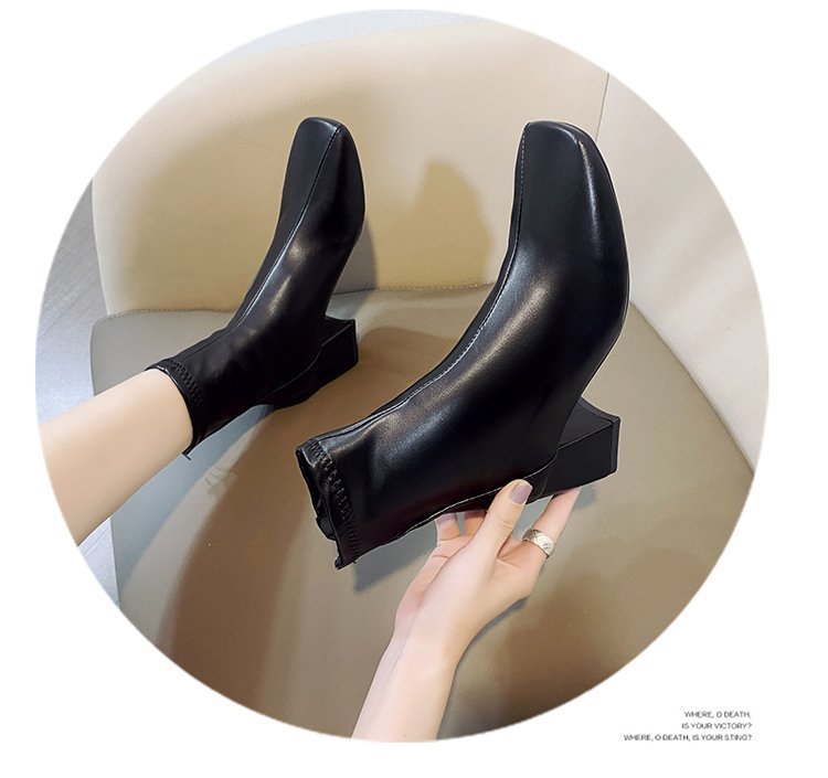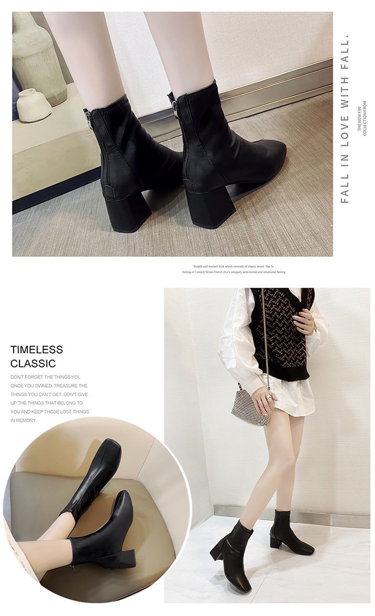 韓国スタイルのスクエアトゥ厚いヒールショートブーツ女性のための 2025 新しいファッションバックジッパーミッドカーフハイヒールマーティンレザーブーツ女性のための