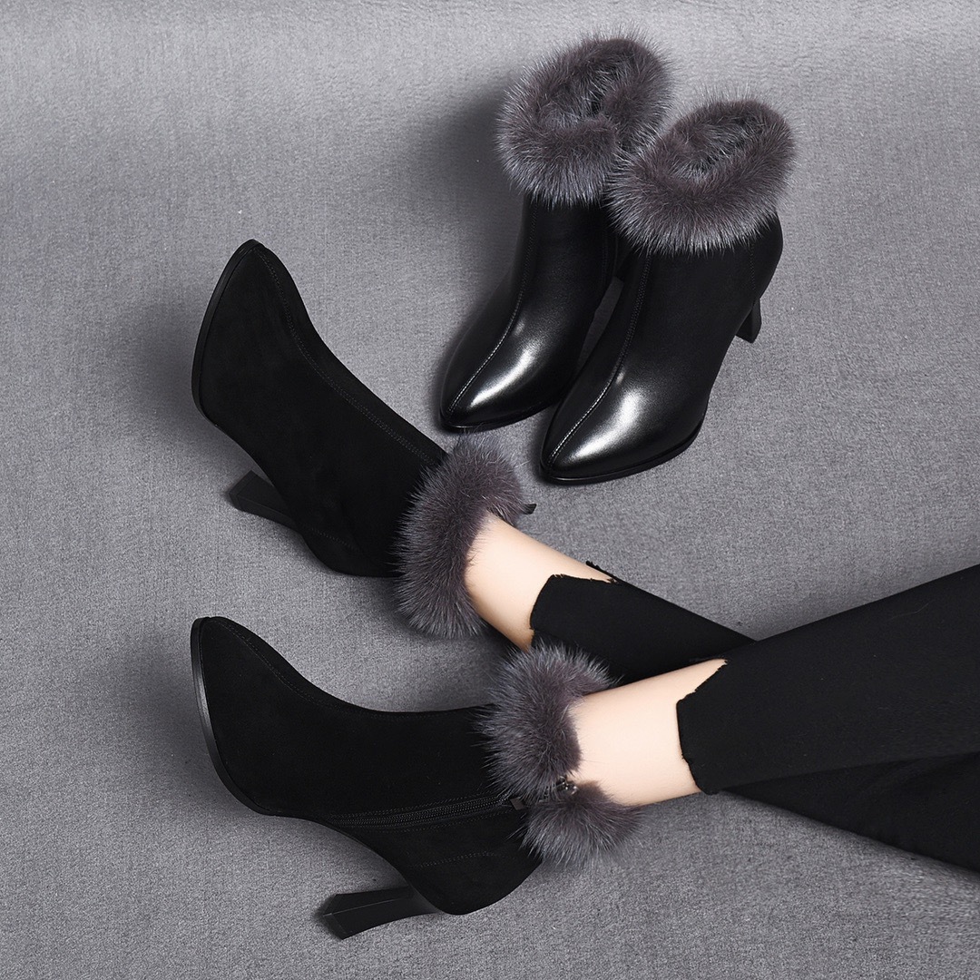 2025年秋冬新作、細ヒール、小ヒール、ショートブーツ、女性らしいハイヒール、裏起毛、本革、ヌバックレザーのレディースブーツ