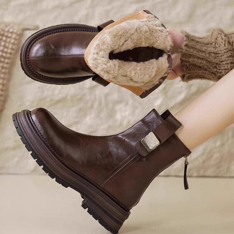 2025秋冬季新款女鞋中筒休闲金属扣加绒马丁靴厚底橡胶时装瘦瘦靴